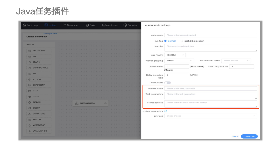 如图,是 Java 任务插件的实现,在 DAG 上去拖拽 Java Method 任务时填上参数即可实现 Worker 对执行器的调用。在 DolphinScheduler 里有很多参数的概念,方便对任务进行各种操作,比如,任务的自定义的参数、流程的全局的参数、启动的参数、还有一些内置的参数。在操作 HTTP 任务时,在 Header 里有 token 字段,并在多个工作流定义里面都使用同样的字段,因此,就有了项目全局参数这样的需求。