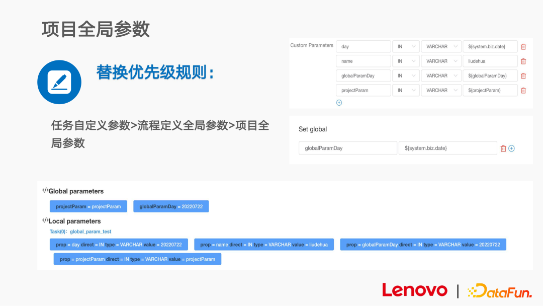 当一个普通任务运行时,任务内的参数根据参数替换优先级规则依次覆盖,参数优先级从高到低为:任务自定义参数 > 流程定义全局参数 > 项目全局参数