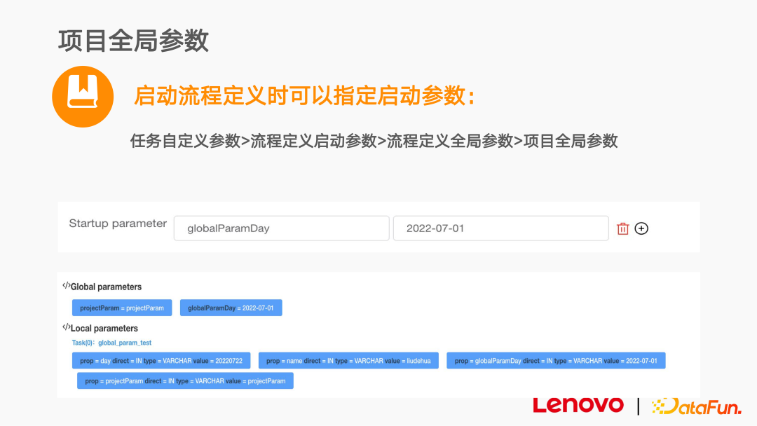 当手动启动流程定义时,可以指定启动参数,这时候参数替换的优先级会发生变化,启动参数覆盖流程定义的全局参数,优先级变为:任务自定义参数 > 流程定义启动参数 > 流程定义全局参数 > 项目全局参数