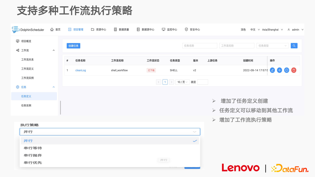 从定位上看,XXL-Job 是一个轻量级分布式的任务调度框架,在业务系统里面需要去写调度的逻辑,同时也能在 XXL-Job 上进行管理;Apache DolphinScheduler 是一个云原生的分布式易扩展的可视化的工作流调度平台,致力于解决任务编排以及错综复杂的依赖关系;Airflow 跟 Dolphin 都是基于 DAG 的调度,但更偏重以编程的方式去编写 DAG,然后对 DAG 进行调度和监控。从对任务类型的支持上看,XXL-Job 支持 Java、Shell、Python 这三种任务类型,支持的任务类型比较有限;Dolphin 和 Airflow 支持的任务类型相对较多,Dolphin 可以支持近 20 种业务类型,覆盖大多数的业务场景;Airflow 也可以支持自定义地扩展。对于可视化的能力,XXL-Job 可配置任务级联触发,但不支持 DAG;而 Dolphin-Scheduler 支持强大的 DAG 可视化拖拽,可以对其任务和依赖关系进行拖拽,并且 DolphinScheduler 在 2.x 也支持通过 Python 代码去构建 DAG;Airflow 更多是通过 Python 代码去构建 DAG。对于调度中心扩展性的要求,当需要开发一些新的任务的时候,XXL-Job 需要通过 Java去开发执行器;DolphinScheduler 通过 SPI 实现自定义任务,更加容易扩展整个 DolphinScheduler 任务的支持能力;Airflow 也支持自定义任务类型,通过 Operator 来支持。在大数据这一块对多租户支持需求比较多,因为需要用到资源的调度,需要用到 Yarn 里面的队列。在 DolphinScheduler 里面就会通过租户对应到 Yarn 里面的队列,这样就可以尽量地保证生产集群上资源的合理分配和较高的资源利用率。对于集群扩展的支持,如何能够线性地去增长,XXL-Job 和 Airflow 更多是在执行器上进行一个水平的扩展。而 DolphinScheduler 的架构设计是 Master 和 Worker,都是无中心化设计,所以都支持动态的伸缩。从易用性上可以看到,DolphinScheduler 强调开箱即用,具备很高的易用性。从社区活跃度来讲,DolphinScheduler 和 Airflow 都是 Apache 顶级项目。从二次开发成本考虑,联想 TDP 团队更多的是采用 Java 语言。综上,我们最终选择了 Apache DolphinScheduler 作为统一的调度中心。当时,联想 TDP 团队是基于 DolphinScheduler 2.x 版本,以下是 2.x 版本的一些功能。
