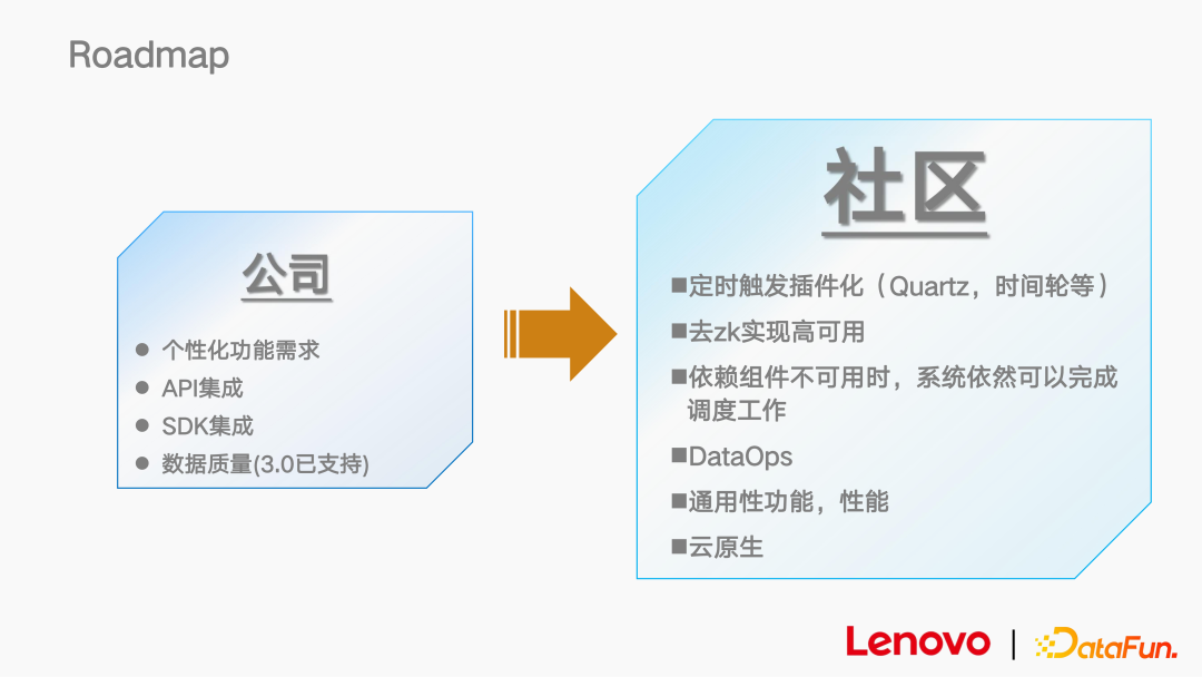 最后是关于联想内部以及 Dolphinscheduler 社区未来的一些规划。(1)根据内部的需求增加个性化功能。比如,对在线状态的工作流定义加入定时的预览,目前 Dolphinscheduler 只可以对下线状态的工作流定义和在编辑中的工作流定义进行预览,之后会对这里进行调整。(2)API 集成。联想各个的业务团队里有着各自的 UI 界面使用,但都需要用到调度的一些特性和功能,比如任务编排、查看任务状态、运行或者定时工作流定义等,这都需要 API 的集成。(3)SDK 集成。目前 Dolphin 里面可以通过 Python 代码快速地生成 DAG,但在 Java SDK 里面需要进行改造。(4)数据质量。Dolphinscheduler 3.0 版本目前已经支持数据质量校验规则的功能。对于社区,个人的思考是未来的 Roadmap 更多集中在任务的触发,任务的调度,任务的执行方面上:(1)定时触发插件化。Dolphin 目前是使用分布式的 Quartz,这里也可以考虑做插件化,比如说通过时间轮的设计,或者用户自定义一个触发逻辑。