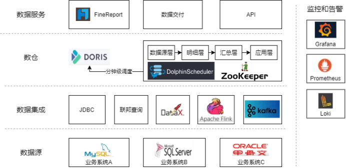 业务模型是最常见的分钟级调度ETL。 离线数据利用DataX进行增量和全量调度,部分指标需要实时统计,因此也借助了Flink CDC 对源表进行实时同步,利用Doris的物化视图或者Aggregate模型表进行实时汇总处理。 脚本语言采用bash+SQL,或者是纯SQL,在Apache Dolphinscheduler上进行管理和发布。 所有层级表模型大部分采用Unique key模型,可以有效保证数据脚本的结果幂等性,Unique key模型完美解决下游数据重复的问题,但是要注意主键不可以重复。 BI系统选择的帆软