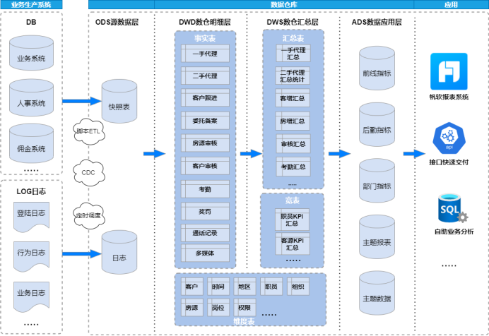| DIM | 维度表存放层,基于业务实体,如客户,房源,职员,职级,岗位等 | 每小时整点全量 |