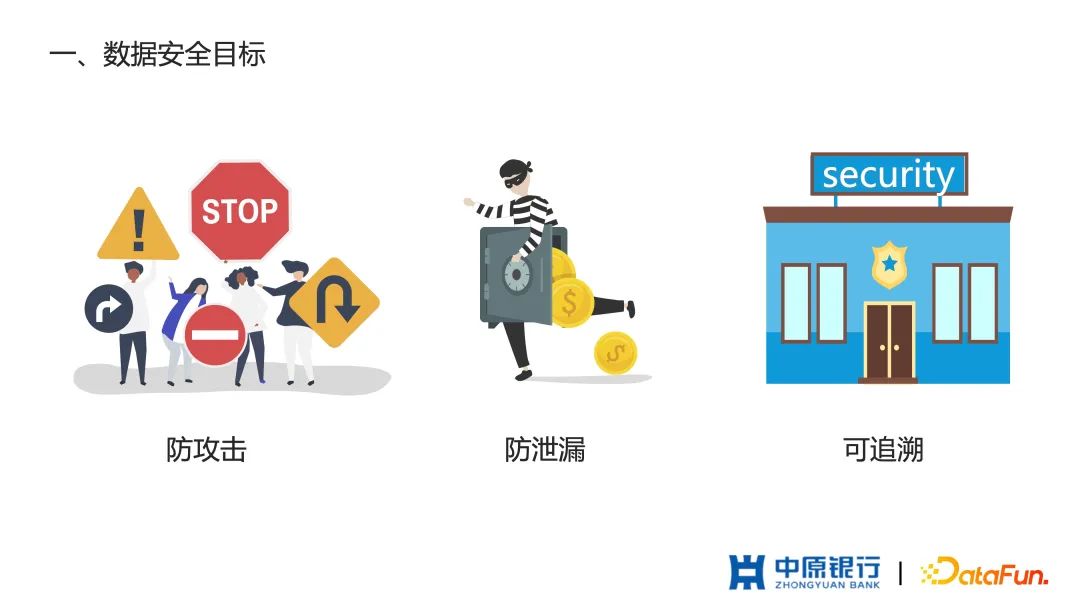 数据安全和信息安全的区别一直以来都是一个热门的讨论话题,要区分数据安全和信息安全,首先要弄明白数据和信息的关联关系。我们理解是数据是信息的载体,但是信息的话也可能就是存在于网络空间之外,对数据的分析可以得到有价值的有用的信息。例如:股市的 K 线图或各种指标数据是属于“数据”,而针对同一份数据不同的人可能得到不同的“信息”,有些人可能得到信息是股票要涨,有些人得到信息是股票要跌。所以基于这些上述的理解,我们判断信息是有价值的资产,是对数据作出的有意义的表达。数据是信息在网络空间的载体,是对信息的记录。信息安全一词最早是用来概述安全体系的,当时还没有出现这么多的细分领域,例如:深度测试、逆向工程、漏洞挖掘、安全防御、攻防验证等等。而数据安全就是以数据为中心的安全保护形式,主要关注的是数据全生命周期的安全与合规,特别是敏感数据的安全与合规,所以数据安全的保护对象与信息安全基本上是一致的。信息安全的保护目标通俗的说包括:非授权人员进不来,进来了拿不走,越权访问看不懂,内部信息无法篡改,做了坏事跑不掉,基本上可以归纳为防泄漏、防攻击和事后可追溯等几个方面。数据安全的目标也是以上几点,既要防止外部攻击窃取数据,又要防止内部误操作泄露数据,并且在触发数据安全风险事件的时候,可以有效追溯到事件的关联方,可以还原事件的一个行为链路。基于这三大目标,中原银行初步形成了数据安全建设的一个思路。例如防攻击方面,我们在外部边界部署了双层异构防火墙、IDS、IPS、WAF、抗 DDOS 等设备。这些安全防护设备,主要是防范外部的攻击,并且通过各类监测分析平台记录用户的访问行为,确保数据的访问行为可审计。我们在银行内部还构建了数据安全管理及技术防护体系的防泄漏机制。数据安全管理体系建设