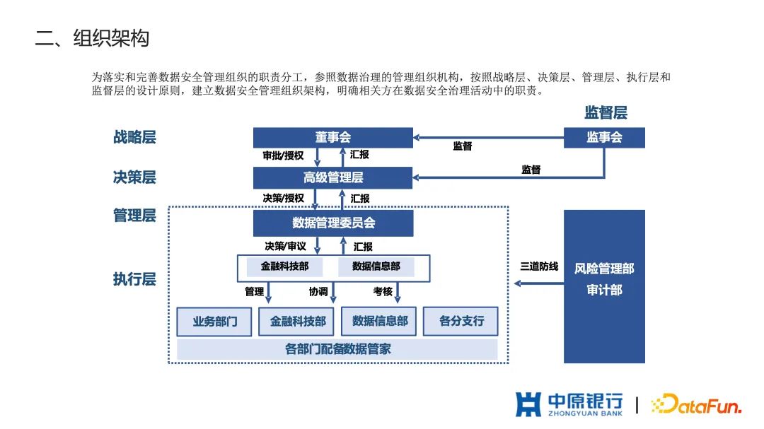 为落实并完善数据安全管理组织的职责分工,中原银行基于业内安全管理组织及数据安全组织搭建的通用实践,并且遵循行内现有数据治理相关组织架构框架的相关要求,沿袭数据治理组织架构的一些建设框架,设计并制定了数据安全管理的组织架构。组织架构在建设时遵循三个原则:第一,符合国家和监管的政策法规;第二,总体要求相对集中、分级管理、专业分工、职责明晰;第三,风险审计和安全管理相互分离、相互制约。数据安全管理的组织架构,按照战略层、决策层、管理层、执行层和监督层的设计原则,明确各相关方在数据安全治理活动中的职责。其中管理层主要是指数据管理委员会,包括科技和业务的一些主要部门作为委员会的常规成员,另外行内数据安全执行层的主要负责人也需要列席参与。执行层主要落脚于金融科技条线的相关部门,包括金融科技部、数据信息部、科技风险三道条线,其中金融科技部属于 1.5 道条线,主要是负责建设运维;二三道条线分别负责数据安全的风险管理和审计工作。除此之外,行内各部门也都配备了数据管家,负责在日常数据安全管理的过程中提供管理或技术上些支持,保证数据安全的各类要求可以快速上传下达。