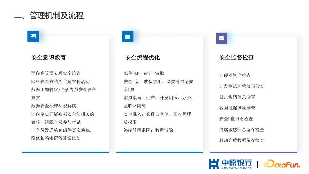 按照三分技术七分管理的原则,强化人员安全意识教育管理,陆续开展高管的专项培训,全员安全意识教育培训与考试,钓鱼邮件演练等活动,多种方式多措并举,有效提升中原银行全行员工的数据安全意识。其中专项培训多采用现场培训或者外聘讲师的模式,在护网等重要的节点去开展。每年行内都会针对内部员工和客户开展网络安全宣传周的定向宣传培训,培训一般会延伸到支行级及网点级。全行性培训主要通过安全期刊、在线平台直播,以及 H5、知识图片、宣传片、动画、折页等方式进行。钓鱼邮件演练,行内也是采用实战演练方式,一般会尝试获取用户邮箱密码等。除此之外,行内每年也会组织数据安全意识相关考试,经过多年的宣传和沉淀,中原银行内部员工都会积极参加并事前做好安全相关的自学习,考试参与率通过率均达到 99% 以上。针对数据使用流程中各项关键节点,我们设置了专项的审批流程,保证数据对外传输的时候,一定会知会到数据审批人知悉并且进行审批授权。我们主要从邮件、终端、网络等层面防范内部数据泄露情况。邮件防泄漏方面,行内部署了邮件 DLP 平台,邮件外发的时候需要经过邮件 DLP 平台识别审计,面向第三方发送的邮件,如果包含敏感信息的话,需要有权审批人进行审批。终端防泄漏方面,行内的全量终端默认禁止移动介质的接入,如果特定场景下必须要使用的话,则要申请安全 U 盘,确保数据拷贝的过程中可审计。除此之外,如果涉及人员的终端退出转网,则需要提前申请终端的转网或退出流程,在完成数据的清除之后,终端才可以再次分发。网络防泄漏方面,行内全面禁止内网访问互联网的行为,推广使用虚拟桌面,实现了生产网、开发测试网、办公网、互联网四网隔离。此外为了防范终端病毒感染进而引发数据泄露,除了安装防病毒软件之外,行内也回收了终端管理员的权限,设置软件白名单,防范未授权软件的任意下载,或者是因病毒感染木马后门等引发数据泄露、数据被恶意加密(例如勒索病毒)等风险。为了验证数据安全管控成效,中原银行数据安全团队会不定期的组织安全相关监督检查。通过以查促改,提升数据安全管控的能力。例如互联网资产的排查,会要求全行员工(包括银行的供应商)对数据资产进行自查,涉及范围包括:互联网网盘、文库、论坛等平台,包括个人自带设备如笔记本电脑、U 盘、移动硬盘等,自查内容为其中是否包含行内的重要或者敏感信息。除此之外,我们也开展开发测试环境的检查,根据最小授权的原则,明确GitLAB、原效平台(行内的项目管理平台)等信息系统中信息资产访问的权限管控是不是遵循最小化原则,从用户权限的规则设置、用户认证方式、访问数据及访问信息资产范围、是过期用户注销和禁用等方面,规范人员的使用要求,并协助相关的测试平台、管理平台等形成信息资产管理权限的统一细则。另外,我们例行工作,还包括日志敏感信息检查、终端留存敏感信息检查等工作。日志敏感信息检查主要排查日志里是否包含有密码、身份证号、手机号等敏感信息。终端留存敏感信息检查,主要检查内网终端是否包含敏感信息。但因为行内终端数量庞大,检查一般会优先检查专用终端,例如制卡数据外发终端、催收数据外发终端等,针对这些用数较多终端开展安全抽查,正常制卡、催收数据都通过专线对接发送,终端不能保留。除了建立基础的机制流程,中原银行在数据采集、数据使用、数据传输等过程中,也初步形成了相关的管理要求。