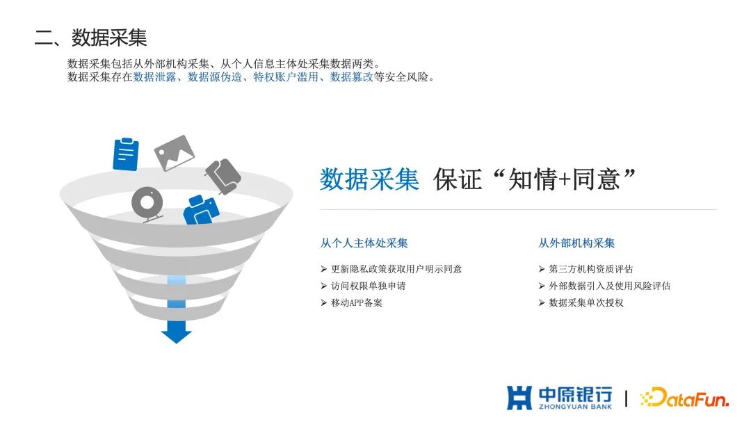 数据采集包括从个人信息主体处和从外部机构采集两个部分,总体遵循知情同意原则。在从个人信息主体采集的时候,通过隐私政策获取客户的明示同意。相机、位置等手机权限获取时,会单独征得客户同意,信息采集的时候按照最小必要原则开展。相关的一些 APP 也已经完成了备案。在从外部机构采集的时候,首先需要完成第三方机构的资质评估,确保数据来源的合法正当,确保数据采集的范围符合金融类业务经营分析反欺诈分析等所必须。如果单次从外部社保、税务、电力等机构获取用户,例如获取水电煤缴费等业务的客户业务数据,则一般会单次弹窗获取客户的授权许可。