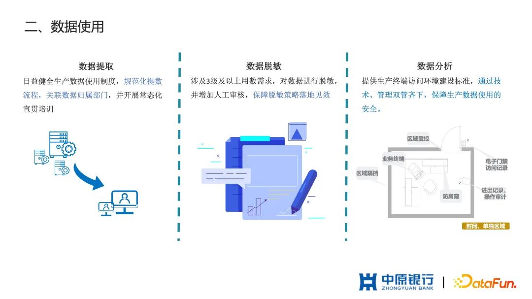 数据使用方面,行内的生产数据脱离生产环境,原则上必须经过数据提取流程审批后才能进行。数据提取需要经过数据申请方、数据所有者、提出脚本编写方、生产变更终端管理责任方和安全的团队综合审批。生产数据在业务系统预览及开发测试环境验证等场景下,原则上需要进行数据脱敏,并且脱敏脚本及脱敏结果,必须由安全团队介入进行人工复核,保障脱敏政策有效落地。对于可访问客户信息的生产终端,行内也制定了生产终端安全管理办法,要求终端房屋环境具备独立房间、防肩窥、进出及操作可审计等条件,要求尽量在封闭的或者相对独立的环境去开展业务终端的业务数据访问,且终端需要禁用移动介质。对于涉及数据分析类系统的访问,我们除了要求以上环境之外,还要求必须通过生产虚拟桌面访问,生产虚拟桌面绑定本地 MAC 地址,保证每台生产终端都责任到人。