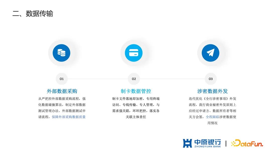 数据传输方面,除了上述的外部数据测试和资质的评估,在引入外部数据之前,需要使用行内的数据开展数据测试来验证这个数据来源的合法性以及数据价值有效性,这个就涉及数据传输了。在这个数据传输测试的过程中,需要对数据内容、数据量,数据加密算法等方面进行评估,检查是否符合安全要求。例如行内默认要求数据内容只允许采用手机号或者身份证号单一要素标识作为客户的一个唯一标识。在数据传输时,要求单次数据量不能超过 1 万条,且需要采用加盐哈希算法,保证数据传输的安全性。另外制卡数据传输的时候则要求必须采用端到端加密专用终端访问,专线传输,专人管理。此外我行还制定了商业秘密管理办法,此办法的管理范围除了电子介质之外,亦包含纸质的文档。在总体的商业秘密管理标准中,我们确定了核心商业秘密、普通商业秘密、内部公开、非商业秘密可公开等分类标准,树立了全行各业务部门针对涉密事项的统一标准。对商业秘密外发也是有相应的审批流程,需要经过申请方、数据所有者,保密牵头部门办公室的统一会签,全程跟踪涉密数据使用情况。数据安全技术体系建设
