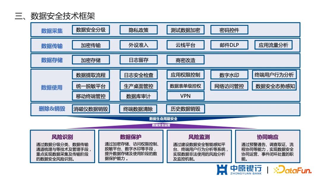 中原银行除了已经建立起来拥有自身特色的数据安全管理体系,在数据安全技术体系方面,也初步形成了数据安全技术框架,其中包括数据采集、数据传输、数据存储、数据使用、数据删除与销毁等全生命周期的数据安全管控体系。(1)数据采集方面,我行建立了数据资产管理平台,实现数据安全分析结果的线上化,并开发推广密码加密的安全组件,实现用户输入的及时加密,保证端到端的数据安全传输。(2)数据传输方面,数据在通过不可信或较低安全性网络进行传输的时候,容易发生数据被窃取、篡改、伪造等安全风险,因此需要建立相应的安全防护措施,保证数据在传输过程的安全性。加密是保证数据传输安全性的一个常用手段,但不同的加密手段会导致对资源的消耗,对数据接口吞吐量以及响应速度等方面造成一些影响。在实际的执行过程中,我们会结合数据的敏感级别以及业务场景来明确定义加密传输的方式和算法。此外,针对移动介质、智能设备等接入终端,也需要经过准入进行控制,保证传输媒介也是安全的。(3)数据销毁阶段方面,当数据的使用生命周期已经结束,总行及全部十几家分行都配备了消磁仪,可以进行已经结束生命周期的数据销毁。基于数据安全体系框架,中原银行已经初步形成了数据安全运营的机制,包括风险识别、数据保护、风险监测、协同响应四个标准的安全运营阶段。(1)风险识别阶段,主要通过数据分级分类、数据传输通道梳理等手段,以及相关的一些技术管理手段,实现数据采集及传输阶段的数据安全风险识别。(2)数据保护,主要通过加密存储、访问权限控制、透明平台、数字水印等手段,提升数据存储及使用阶段的数据保护能力。(3)风险监测阶段,主要通过建设 SOC 平台、应用流量分析平台、数据安全智能感知平台、终端用户行为分析平台等系统,实现数据非法使用的风险分析及监控。(4)协同响应阶段,主要通过预警通告、调查取证以及数据安全管理体系里数据安全干系人(例如数据管家、合规专员)流程的协同,实现数据安全协同的运营及事件闭环处置。