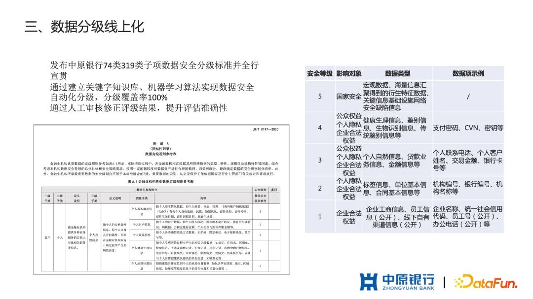 《数据安全法》第二十一条指出,国家建立数据安全分级分类保护制度,根据数据在经济社会发展中的重要程度,以及一旦遭到破坏、篡改、泄露或者非法获取非法利用,对国家安全公共利益或者个人组织合法权益造成的危害程度,对数据实行分级分类保护。数据分级分类标准,基于《网络安全法》《数据安全法》等法律法规,由国家协调统筹,相关部门应该按照数据安全分级分类的制度,明确制定本行业本部门及相关行业领域的重要数据目录,对列入目录的数据进行重点保护。同时针对关系国家安全,国民经济命脉、重要民生、重大公共利益等数据属于国家核心数据,实行更加严格的管控制度。例如在金融领域,2020 年中国人民银行就正式发布了《金融数据安全 数据安全分级指南》。数据安全分级在数据安全治理的过程当中至关重要,数据的分级是数据重要性的一个直观化的展示,是后续在技术运维支撑体系落地中实现数据安全管控力度精细化、数据访问权限管理精细化的基础。中原银行根据人行发布的《金融数据安全 数据安全分级指南》,依托前期数据治理的成果,整理形成适合本行的数据安全分级标准。标准主要包括 74 类数据项和 319 类数据子项,其中包括重要数据、个人高敏感信息,个人自然信息,企业基本信息等分类,同时按照从高到低的顺序,我行将数据分为 5 个安全级别。关于数据安全等级分级的判定原则,为了让业务部门能更好的理解,通俗来说可以按以下一个简要的判断标准来判定:(1)5 级数据:是指重要数据,它是一个专有名词,一般是指宏观经济数据、海量信息汇聚产生的衍生特征数据、或者行业监管机构执法过程中产生的数据等。(2)4 级数据:是可能对人身财产安全受到威胁的数据,例如交易密码遗失可能造成财产损失,健康生理信息的泄露,可能会影响人的健康甚至生命安全。(3)3 级数据:是指就泄露后可能会侵犯个人的隐私,例如手机号泄露可能会频繁接收到骚扰短信骚扰电话。3 级数据中最需要关注的是银行卡四要素信息,包括身份证号、手机号、银行卡号、地址。3 级数据时需要业务部门了解的最常见数据。(5)1 级数据:是指可以公开的数据。