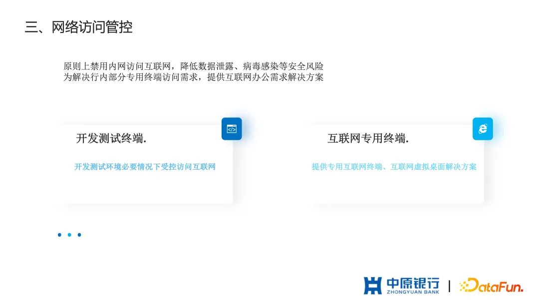 中原银行原则上禁止内网访问互联网,从而降低数据泄露以及病毒感染的安全风险。但为了解决行内部分专用终端的互联网访问需求,安全团队会根据业务的需求进行平衡,也提供了互联网办公终端的一个访问方式。例如像 Mac 类开发测试终端在开发时进行 iOS 升级、XCode 的升级,或者互联网 APP 需要做互联测试的时候,这些场景下如果需要访问互联网,一般通过临时性的策略开启访问路径,同时还会附加访问地址的白名单、绑定行内 WiFi 等形式保证终端及用户的受控访问。当智能设备测试的时候,设备是由行内统一配发,接入时需要安装行内移动终端安全管理系统 EMM,避免终端遗失等场景下的数据泄露风险。针对社保税务缴纳、万德数据分析等业务分析场景,也提供专用的互联网终端或者互联网虚拟桌面。同时行内的互联网虚拟桌面设置了关机自动还原,降低在使用互联网终端时数据泄露的风险。