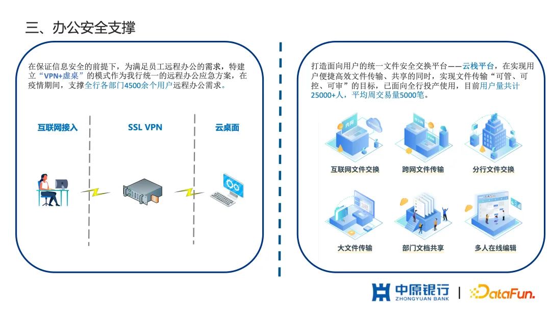办公安全支撑主要包括 VPN 的引入和云栈平台的部署。在保证信息安全的前提下,为了应对员工在疫情影响下的远程办公访问需求,中原银行建立了 VPN + 虚拟桌面的模式,作为统一的远程办公应急方案,目前已经累计支撑全行各业务部门 4500 多个用户的远程办公需求。在推广 VPN 的时候,我们采用多种手段保障数据的安全性,例如密码加短信验证码的多重登录认证、网络访问策略限制、终端 MAC 绑定,SOC 对平台流量接入的分析等,对远程接入的终端进行管控。同时 VPN 接入的访问时长也进行限制,原则上需要在常规的 5×8 的工作时间内。另外每个远程办公工作周期结束后,系统会默认回收所有的 VPN 资源,如果下一轮再有需求的话,按用户逐个再开通。中原银行禁用了文件跨网传输,限制了系统访问权限,禁用了 U 盘的广泛使用,那么为了解决行内终端用户之间的文件传输问题,我们也打造了面向全行用户推广使用的统一文件安全交换平台——“云栈平台”。云栈平台在完成用户便捷高效文件传输共享的同时,实现文件传输的可管可控可审计的目标。行内网络划分为生产、开发测试、办公、互联网等环境,安全级别是生产>开发测试>办公>互联网,互联网网络的安全级别是最低的,基于安全级别实现数据的可控传输。同安全级别网络间的数据传输可以直接传输,如果跨安全级别,则从低安全级别向高安全级别可以直接传输,如果从高安全级别向低安全级别传输,必须经过有权审批人审批,确保数据流转的受控。另外,行内针对生产环境进行单独管控,因为它包含核心的业务数据,管理也更加严格。如果数据要脱离生产环境必须关联提数流程,数据进入生产环境必须关联变更流程。目前云栈平台已面向全行所有内部员工,均开通了相对应的账户,平台平均周交易也是高达 5000 笔以上,实现了云栈平台在全行的覆盖和推广使用。