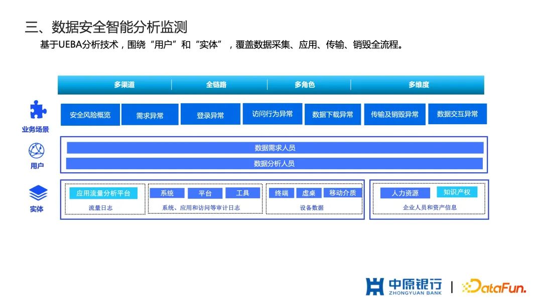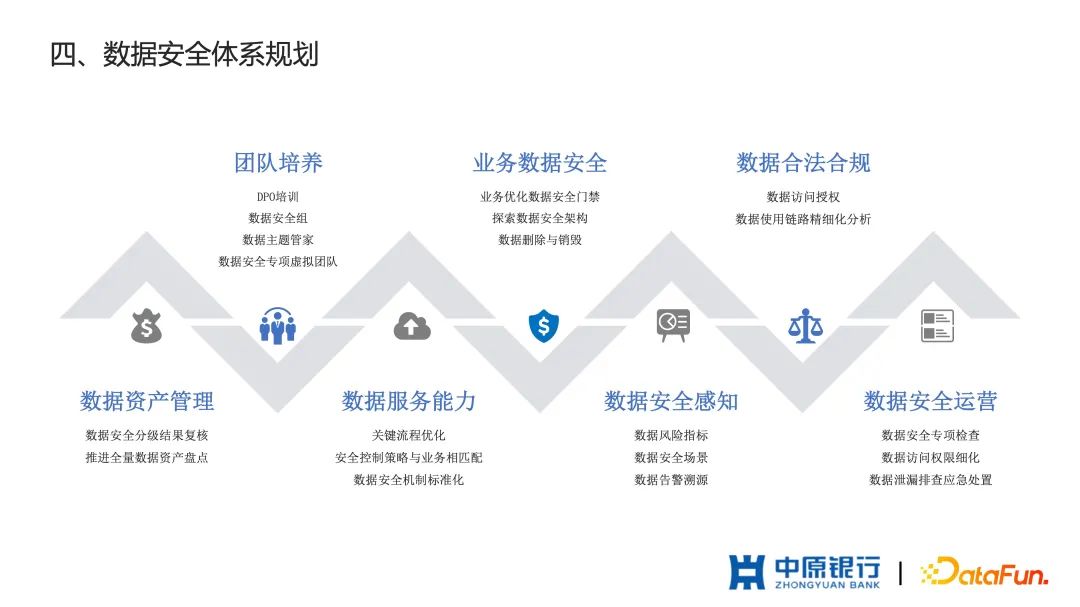 数据安全除了各种保护措施外,也包括安全对抗的过程,或者换个角度,安全管理内的各种管理及技术手段,从来都是降低风险,没有办法消除风险,总会存在各种事先无法预估的剩余风险。所以在各类保护措施实施后,针对未发布未识别的数据安全风险,或者点滴式少量多次获取数据的爬取风险等,仍然需要提供监测分析手段。为此中原银行建立了数据安全智能分析监测平台,基于 UEBA 用户和实体行为分析技术,围绕用户和实体数据使用行为进行分析,覆盖数据采集、应用、传输、数据销毁全流程,综合采用规则加机器学习技术,实现数据安全风险的智能化的分析监控。数据安全智能分析监测平台建设的时候,主要是依据用户或实体获取使用数据行为的路径规划,对用户提数过程中的需求异常、登录异常、访问行为异常、数据下载行为异常、传输及销毁数据等全链路行为轨迹分析。例如用户进行数据访问时,其行为路径一定是先提出数据需求申请之后再登录业务系统,然后查询预览数据,下载导出数据,最后向第三人传输数据以及最后的销毁数据。数据安全智能分析监测平台在监测这些全链路的数据访问行踪轨迹时,从场景入手,接入文件传输平台、终端准入系统,终端管控系统、内部应用系统(例如 CRM)等系统的日志或者流量进行分析,设计了账号共享、数据下载次数过多、文件传输时间点异常、使用未注册的移动介质接入、接入介质配置不当等将近 40 个风险场景。平台重点关注数据建模师、监管报送人员、开发测试人员等有业务数据代码数据的重点使用人员。除此之外,中原银行组建了一线 7×24 小时,二线 5×8 小时的数据安全运营值守团队,编制了数据安全风险告知书,通过数据主题管家、合规专员等角色,对数据安全风险进行人工宣贯。目前也正在开发内部办公应用的公众号小程序通知,确保数据处理时效更快捷,将数据安全风险能及时告知相关责任人,确保各类安全风险得到有效处置。在数据安全体系方面,虽然已经建立了数据安全管理体系和技术体系,但为了衡量目前数据安全的能力现状以及能力欠缺,还需针对数据安全体系进行回顾验证评估。中原银行在进行数据安全体系建设规划的时候,主要践行以安全合规为红线,充分借鉴现有的数据安全标准,结合行内的实际业务场景,依托数据治理的项目成果,全面开展数据全生命周期的建设。建设体系里以治理方针作为前提指导,建设过程中以业务目标为导向,针对合规高风险领域和业务需求紧迫度比较高的领域,优先开展数据安全的治理。中原银行坚持组织建设先行,职责明确为工作开展的基础,人员能力提升为工作落实进行保障;坚持制度先行,进一步明确各类的流程操作指引;坚持技术能力和管理机制同步建设,为管理效率提升提供保障;坚持通过风险评估、成熟度持续评估等手段去优化体系。数据安全治理的核心是保障数据采集、传输、存储、使用、交换、销毁等全数据安全生命周期流程的安全可控。在数据安全管理及技术体系中介绍的组织保障、人员能力提升、制度体系建设规划的评价和改进、数据识别保护监测响应平台等,都是为了保障全流程的安全提供支撑。团队培养、业务数据安全、数据合法合规是数据安全体系规划的指导方针;数据资产管理、数据服务能力、数据安全感知、数据安全运营是数据安全体系规划的基础保障;数据全流程各个场景下的保护是数据安全体系建设的核心。数据安全它相对独立,但是又与安全体系中其他层级,例如应用安全,网络安全等息息相关,数据安全向其他各安全域输出相关的安全要求。同时,各应用系统、网络边界、安全组件建设过程中,也为数据安全落地提供了强有力的支撑。例如应用安全方面,在信息系统产品研发的过程中,针对安全培训、需求分析、系统设计、系统开发、安全测试、安全部署这六个环节,每阶段都设置数据安全管控的节点,建立由各相关部门参与的数据安全审核机制,明确落实数据全生命周期的管控要求等。安全建设遵循木桶原理,需要各个层面统筹规划,保证同步规划、同步建设、同步使用。虽然目前依据行内的数据安全体系规划作为总体指导,但仍然需要继续进行查漏补缺。下一步,我行将借鉴行业内的数据安全管理最佳实践,在后续的工作中进一步推进开展资产管理、团队培养、数据服务能力等层面建设。另外重点关注数据安全的检查评估,使行内安全控制措施与业务发展相匹配,强化自己的服务定位。在数据安全工程方面,中原银行开始在全流程中做到一些介入,目前层级主要在集中在需求设计阶段和后续的安全验证阶段,但在中间其他环节,例如已结束生命周期的历史数据销毁、数据全生命周期画像、数据使用链路精细化分析等方面介入还不够深入,有待未来更进一步的研究。数据安全管控工作需要持续提升安全防护能力,为我行的数字化转型提供保驾护航。Q1:针对于终端的敏感信息怎么检查,形式是什么?比如是定期使用安全软件或者人工的检查?流程是怎么样的? A1:终端安全检查我们主要采用两种方式,一是个人自带设备,例如个人笔记本的自查,另外是专用终端的安全检查,包括催收制卡专项数据排查。针对全量终端的数据安全敏感信息检查,例如敏感文件的扫描之类,我们在实践中也担心扫描会影响办公效率,因此一般会以