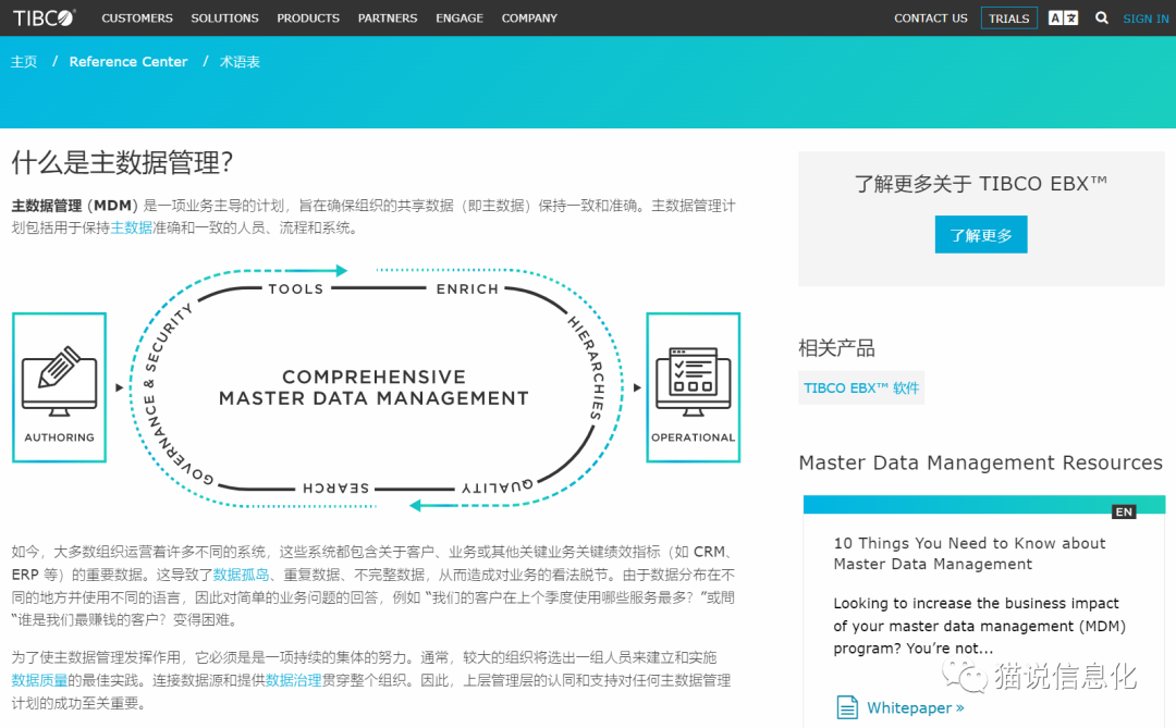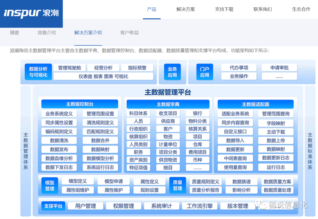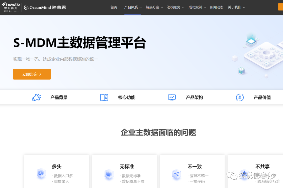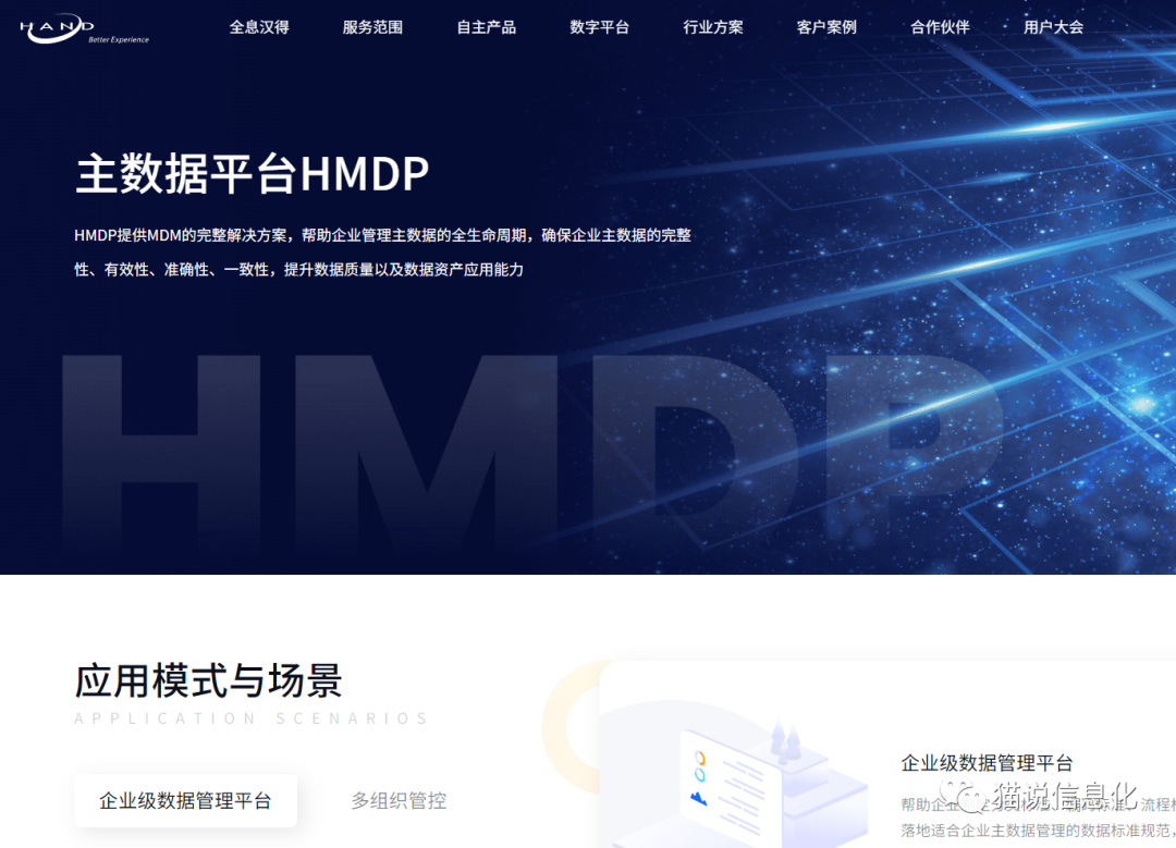 在多系统集成时主数据管理系统(MDM)是很常用的软件,例如异构系统之间,跨组织应用的系统之间。因为很常用,所以开发主数据管理软件产品的厂商也很多,首先是以包括主数据管理系统为主要产品的一些专业的数据管理类软件厂商,而且这些厂商不少都是从主数据管理起步逐渐发展为综合性数据软件厂商的,例如三维天地、美林、亿信华辰等。还有一些专业数据类软件厂商开展过主数据业务,但现在从其官方资料中不能直接找到主数据的内容,可能是涵盖在其大数据平台、数据治理平台等产品中了,这部分厂商本文暂不介绍。其次是包括以ERP软件产品为核心的企业管理软件厂商,例如用友、金蝶、浪潮、SAP等,较多的企业信息化项目是以ERP系统为核心按需集成相关应用系统的,那么为了更好的实现集成,ERP软件厂商就相应开发了主数据管理软件产品。再例如一些有规模的、综合性的企业信息化厂商,因为这些厂商承建的很多项目都有大量的系统集成内容,所以也开发了自己的主数据管理软件,比如汉得、元年、石化盈科、昆仑数智、英诺森、软通动力等。还有若干种情况,总的来说,如果厂商经常要实现系统集成应用,往往就会开发自己的主数据管理软件产品。此处需要说明的是,主数据首先是用于系统集成的,主数据管理是为了实现系统集成时数据和业务的互通互联,保障主数据的唯一性、标准性和共享性的,进而保障业务数据的一致性。所以很多年前在面向服务的体系架构下(SOA),与企业服务总线系统(ESB)一起,很好的解决了系统集成的问题。而主数据作为数据的一种,自然也会被列入数据治理的范畴内,并随着近些年开始被广泛重视的数据治理而被进一步关注到,但实际上主数据以及主数据管理系统是远远早于数据治理热潮之前就被广泛应用的,主数据管理软件的产品也已很成熟,并且也随着技术的发展,在本地部署的产品之外也出现了云版本的产品,为用户提供了更多的选择。