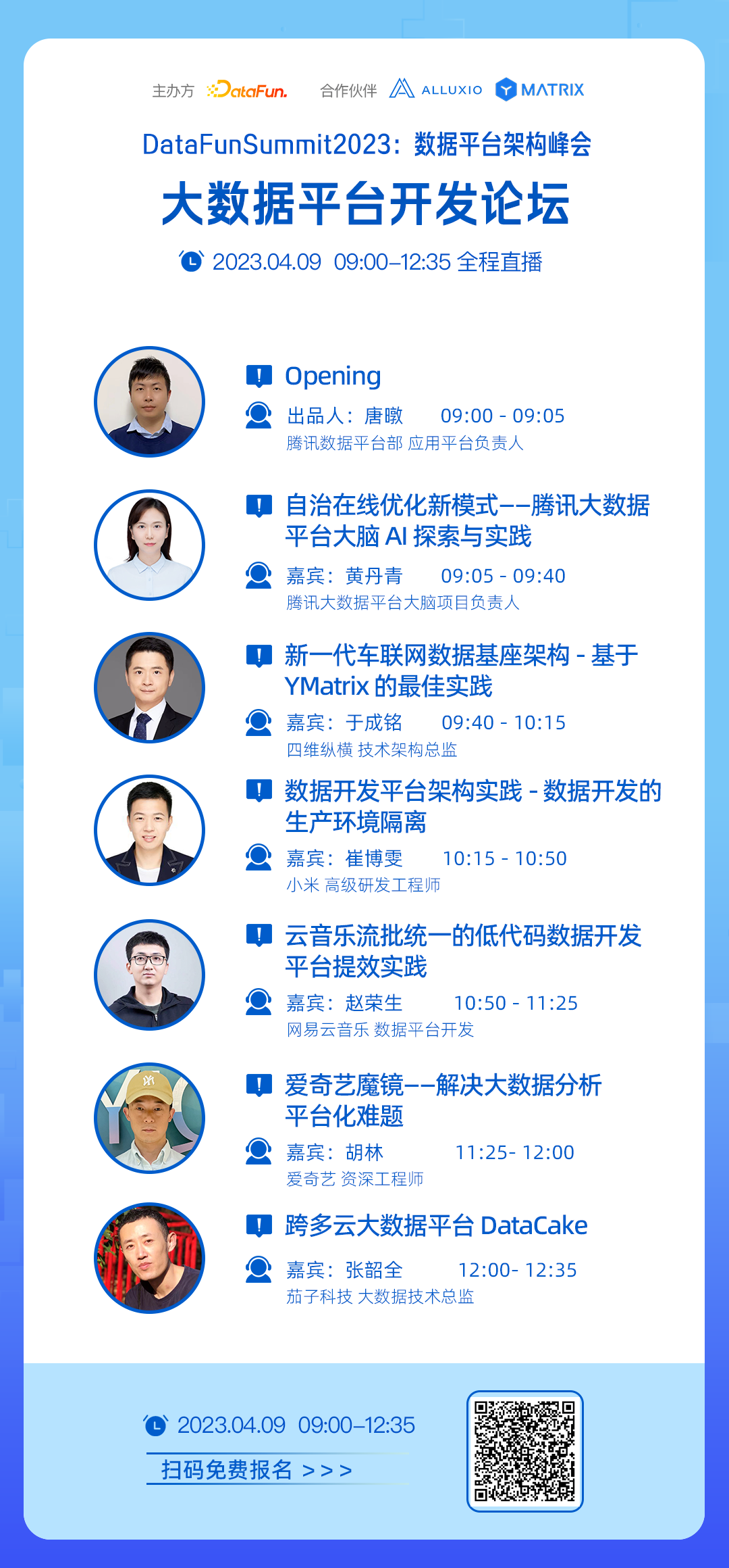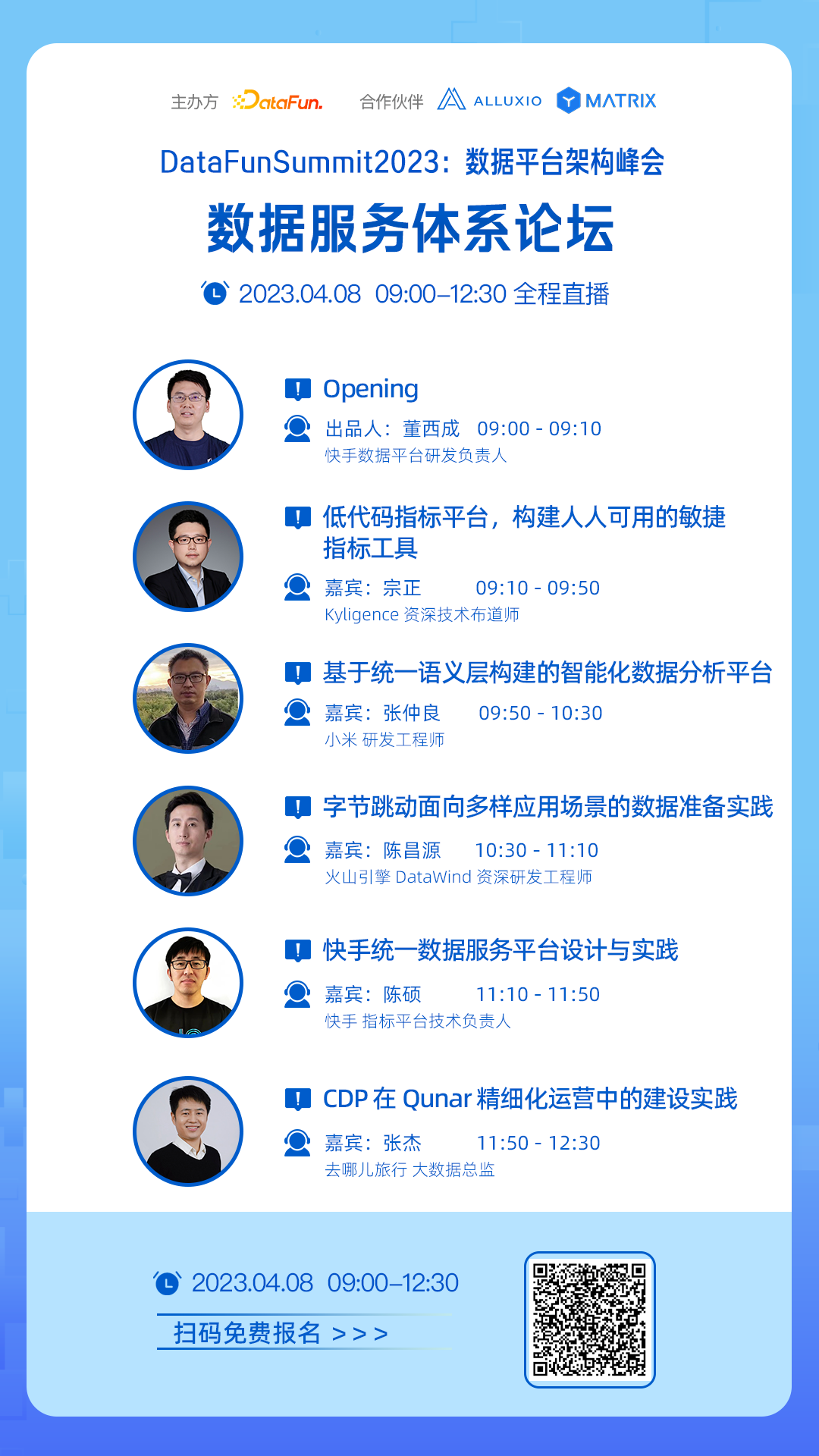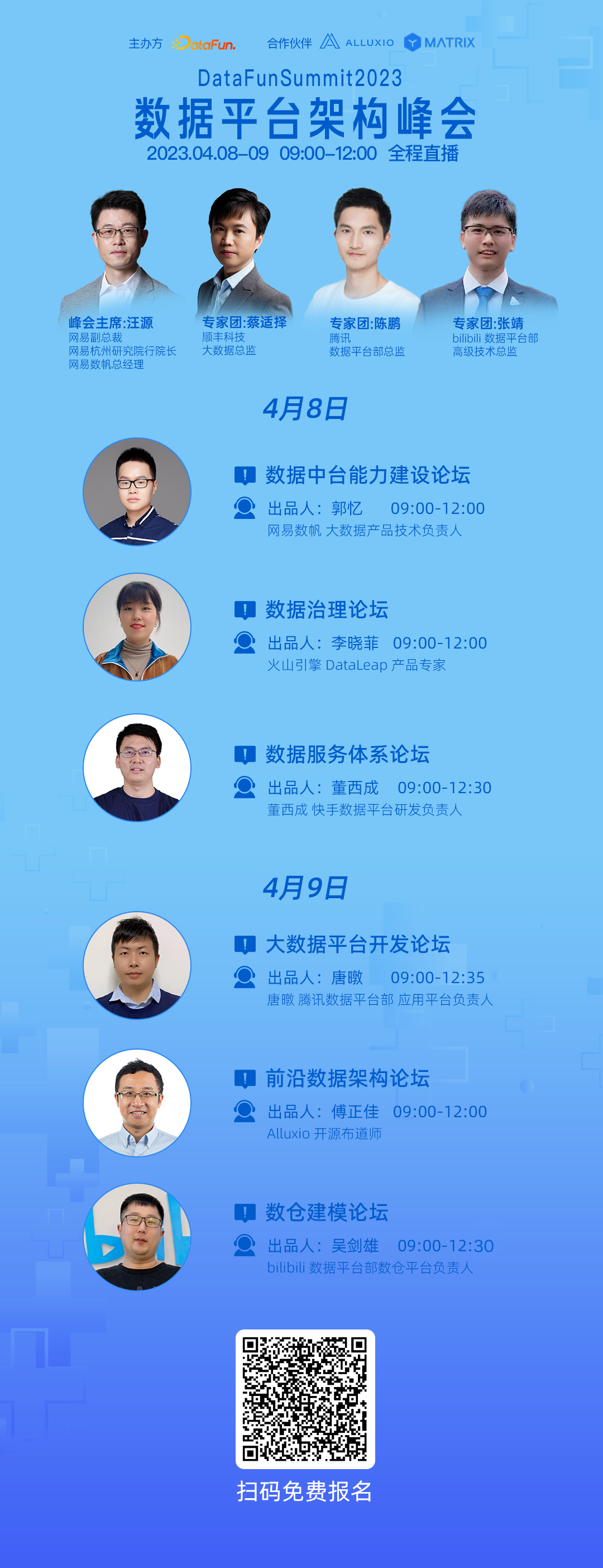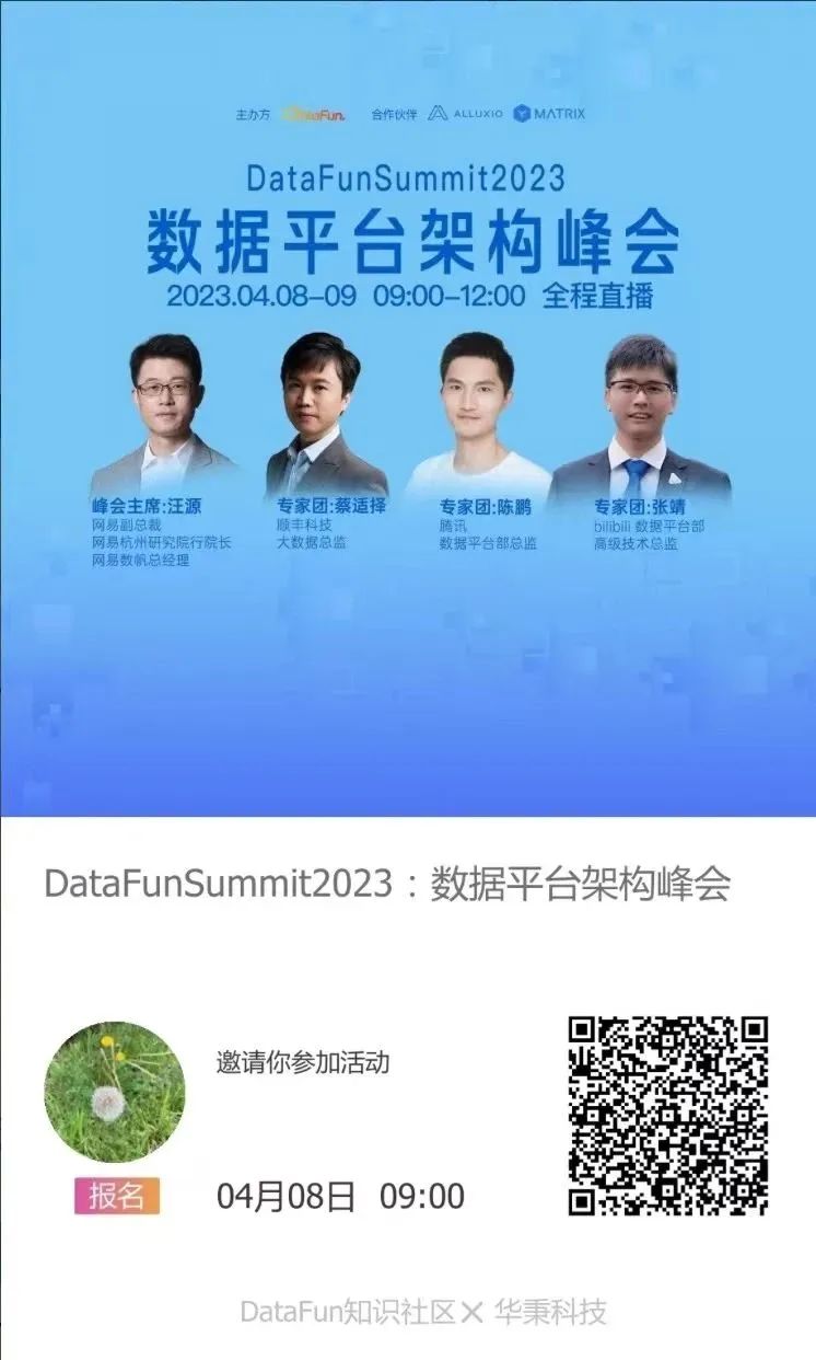 为了尝试解答上述问题,2023年4月8-9日,DataFun举办了第1届数据平台架构峰会。本次峰会由1位主席与3位专家团成员和6位论坛出品人精心策划而成,共包含了:数据中台能力建设、数据治理、数据服务体系、大数据平台开发、前沿数据架构、数仓建模等6个论坛,邀请20余位来自一线的数据平台技术专家,进行深度分享交流。本次峰会将全程直播,欢迎大家扫码免费报名收看: