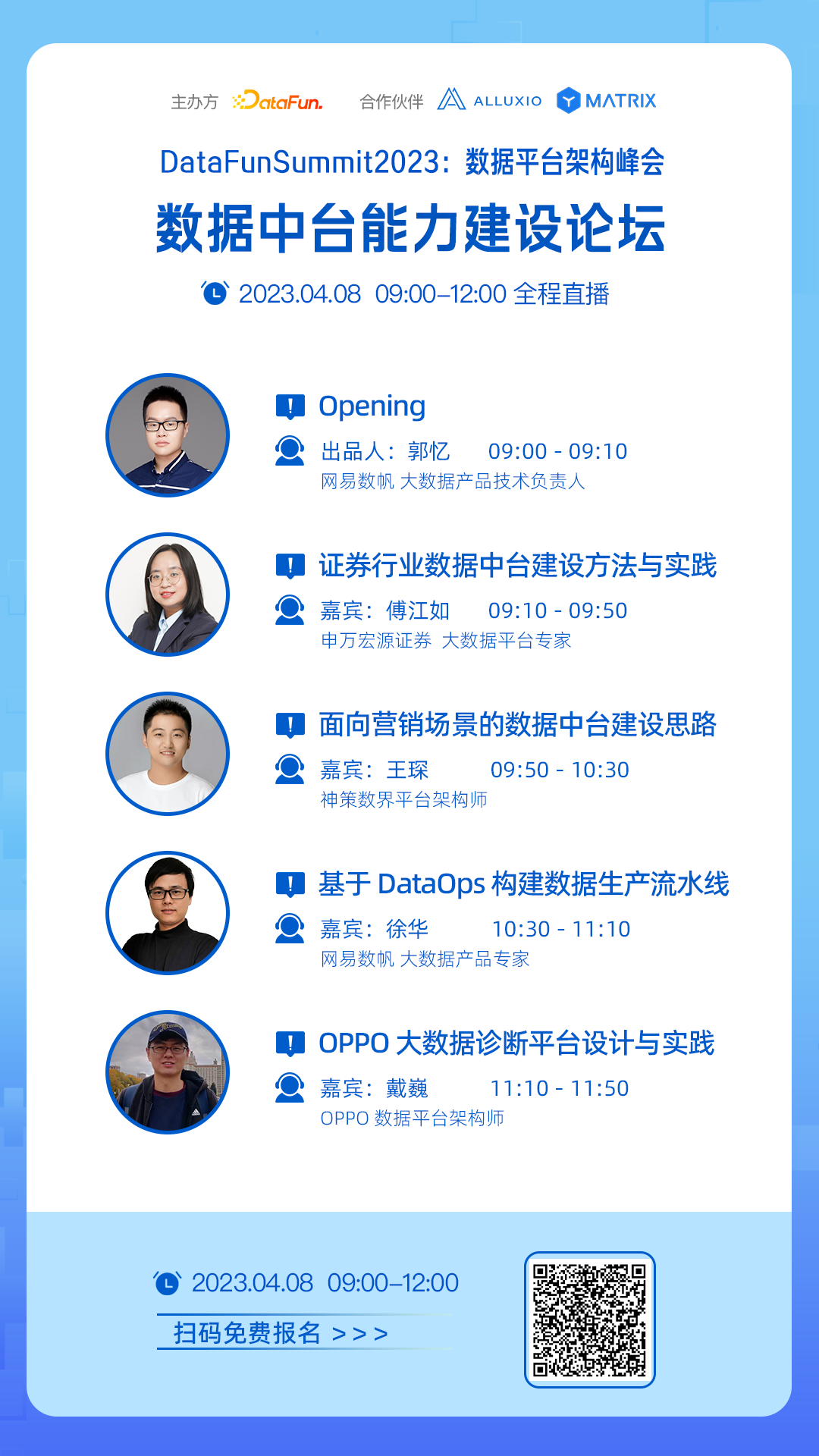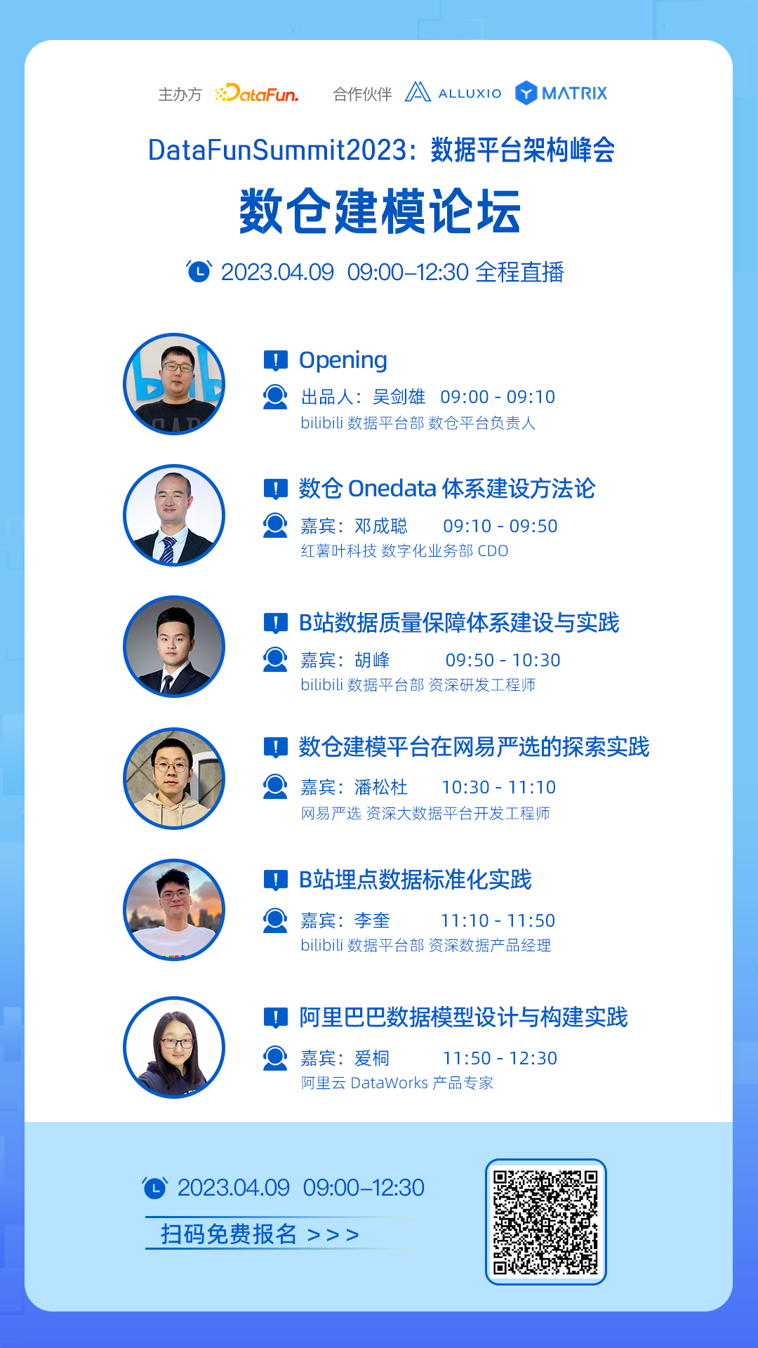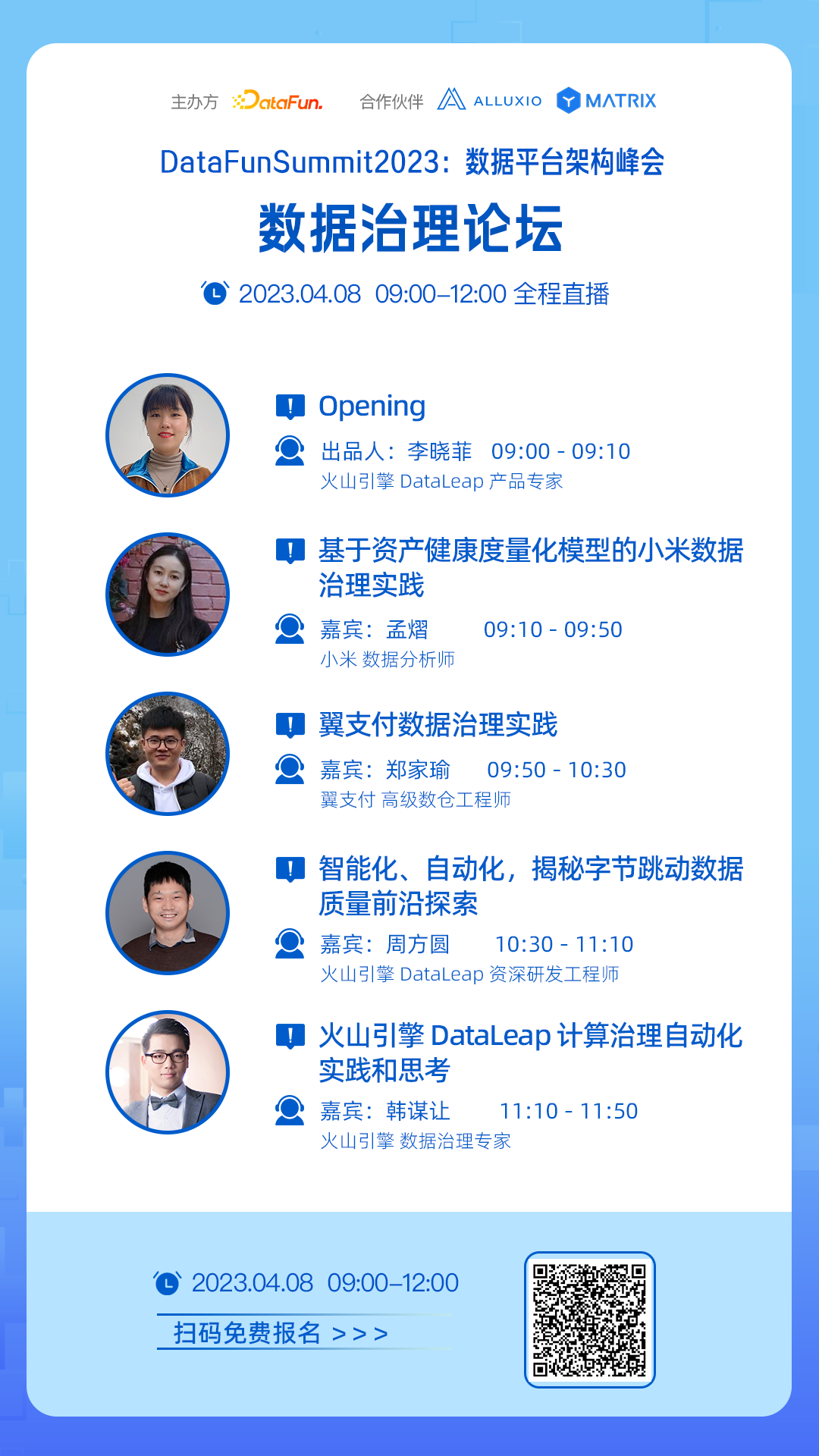 为了尝试解答上述问题,2023年4月8-9日,DataFun举办了第1届数据平台架构峰会。本次峰会由1位主席与3位专家团成员和6位论坛出品人精心策划而成,共包含了:数据中台能力建设、数据治理、数据服务体系、大数据平台开发、前沿数据架构、数仓建模等6个论坛,邀请20余位来自一线的数据平台技术专家,进行深度分享交流。本次峰会将全程直播,欢迎大家扫码免费报名收看:
