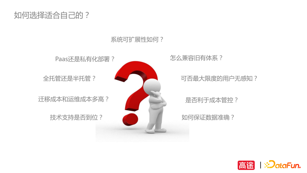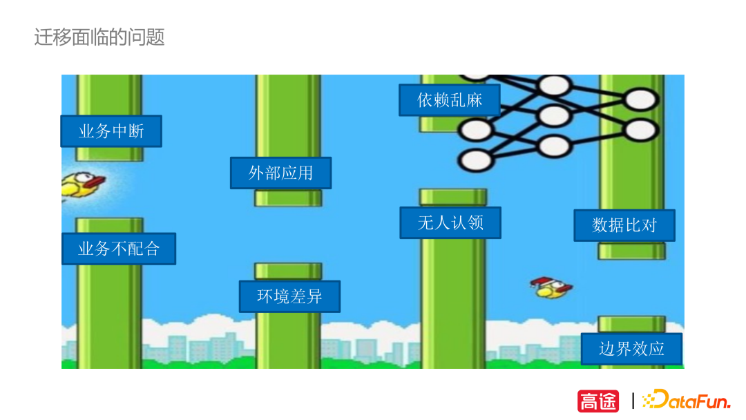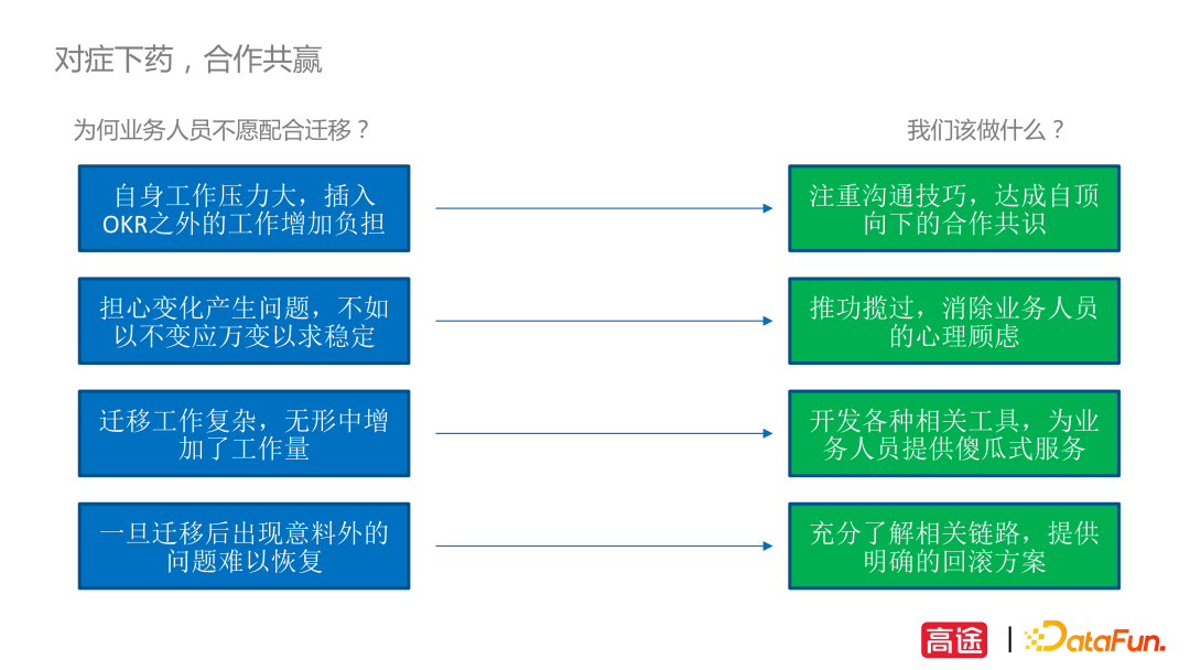 首先要面对选型的问题。已经确定选云以后,各个厂家纷至沓来,介绍其产品。但是直到做决策的时候,才发现是非常难的。因为我们心里想解决的问题很多,既想降成本少花钱,又想有优质服务,还想迁移能轻松一些,并且以后迭代能更顺畅。一旦考虑太多,总想着“既要又要也要还要”,那决策就十分难做了。下一步迁移时具体面临的问题,情况更为复杂和具有挑战性。● 实际问题:比如说大批量数据拷贝、结果比对;再比如说迁移任务需要业务方的支持,特别还需要说服他们支持和给于一定的容错的空间;● 互斥性问题:比如迁移的速度和质量往往就存在天然的矛盾;再比如有一些表没人认领,不知道是否还在使用,如果一直跑就会占用计算资源和存储资源,如果停了又可能会出事。