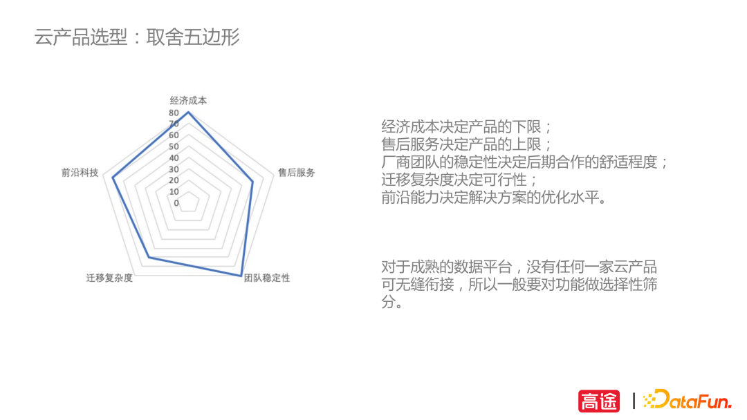 选定厂家产品的过程中,我们总结归纳了上图所示的一个五边形:● 经济成本和售后服务:对于上层领导来说,最关心经济成本和售后服务,因为这两个都是直接跟经济收益相关的;● 迁移复杂度:对于执行迁移工作的团队来说最看重这点,要保证最终的可行性;● 前沿科技:这也是我们考量的一个标准,会影响到长期目标,架构调整和架构升级;● 团队稳定性:最后厂商的团队稳定性也是需要考量的,大家都不希望厂商三天两头换对接人,从这一点来说大厂可能更有优势一些。对于成熟的数据平台,像高途已经运营了两三年,有很多自身烙印了,已经没有任何一家云产品可以无缝衔接,所以只能针对功能做选择筛分。