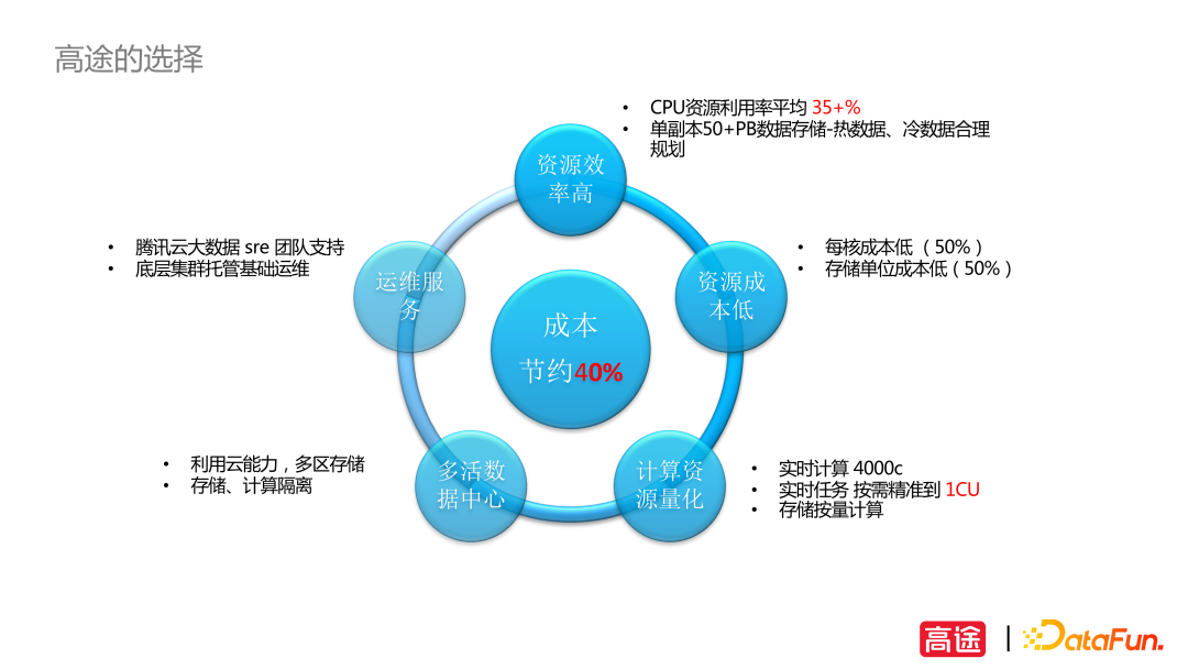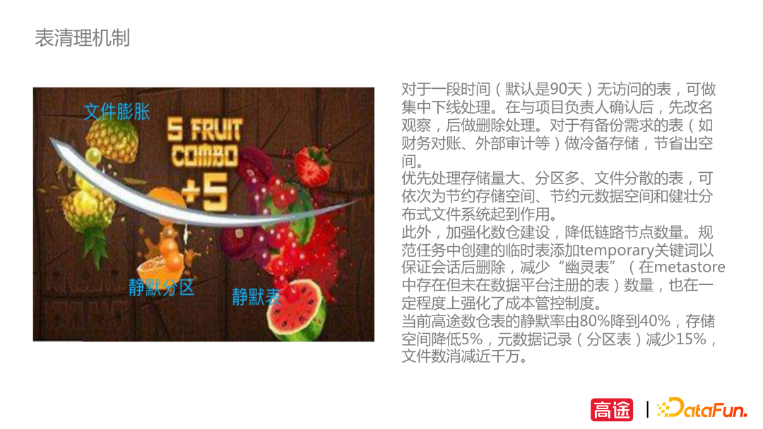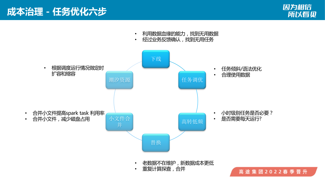 与业务人员的合作中遇到过很多麻烦,业务方可能基于各种原因不配合迁移工作,原因无外乎两个,一是没有时间,二是担心风险。如果能解决这两个问题,那么用户积极性自然就上来了。我们的做法是:第一,针对用户繁忙,我们把力所能及的事都处理掉,比如拷贝数据,重置偏移量,搭建测试环境等,到业务侧就只需要做简单的修改配置、重启进程、重启服务,这样就解决了时间不足的问题;第二,针对风险担忧,推功揽过,排除其后顾之忧;另外,还是要主次分明,有一些很琐碎问题,比如是否有人在外部直连我们的主服务,迁移是否有影响等等,只要抱着“做大放小、主次分明”的态度,问题就会迎刃而解。高途刚迁移完成时,在腾讯云上的成本相比平台自建时期降低了 40%。但随着业务重点发力成人与职业教育、素质教育,大数据计算和存储资源的使用量又开始快速增长,所以大数据平台需要进一步进行成本治理和资源利用率治理。很多人可能第一感觉就是省钱,降低支出,其实不然。我们的投入是要求产出的,如果花了 50 赚回 100,那么这 50 就花的值;我花了 20 结果都打水漂了,那 20 花的就不值。所以仅看投入支出,不看产出,实际上是一个错误的想法。如果集群 CPU 利用率是 20%,现在提到 80%了,那么就做到成本管控了?这里有悖论,假如只写一个死循环,然后在后边一直刷单,那么 CPU 利用率肯定高涨,这其实是一个自欺欺人的伪命题,并没有真的做到成本管控。所以我们最终目的是提高有效利用率,既能把利用率提上去,还要减少浪费,这才是成本管控的最终目的。有两方面,一是存储资源,二是计算资源。途径还是开源和节流。有 1 个必须维护的任务,以前可能花 10 个单位的成本,因为运用新技术后可能 5 个单位就解决了,这是开源。原来任务得花 5 个单位的成本去维护,但是发现这个任务无人使用,后把它给将其下线,这就是节流。先说一下存储资源当时的状态和问题,存储资源的浪费无外乎以下三点:● 表空跑:表没人访问,还每天都在跑,还在生成新的数据;● 分区膨胀:有一些业务线的表是小时级,这样分区就过度膨胀,分区数量可能达到几千上万个;而且大家也感受到当分区数量过多的时候,重启hiveserver2,就会有相当长的时间一直在加载元数据,无法正常服务;● 碎文件:主要来自 ods 层,因为我们是用 waterdrop 导入数据,该工具天然的存在一些碎文件问题,这样不仅给文件系统(不管是 hdfs namenode,还是我们现在使用的 cos)的中心进程带来巨大压力;当查表的时候,如果表里同样是 1GB 的数据,数据分散在 10 个文件里边和分散在 1 万个文件里边,效果也是不一样的,在1万个文件里边的话,可能 hive2 还没有把这个任务提交到 yarn,就因为内存不足任务先崩溃了。