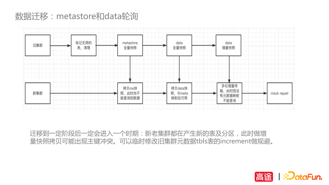 首先是数据迁移。在迁移数据以前我们查了一些资料和大厂迁移的规范,发现大家普遍的精力都是放在了数据迁移上,而很少提到数据和元数据的搭配迁移;数据迁移过以后,如果没有元数据辅佐的话,它只是一堆不可读的文件,所以我们当时设立了一整套的组合迁移(上图是组合迁移的流程)。● 标记无用的表并清理:第一步是瘦身,旧系统先根据自身情况,把一些无用的、不用迁移的数据提前干掉,这样在后边迁移的时候能节约很多带宽;● Metastore 全量快照:第二步“设定时间点”,以这个点为中心,把元数据全量的 dump 到新集群的 metastore,这时两边的表包括 ID 都是一致的,旧数仓的 partition 在分区新的集群里也有,但此时新集群的分区中查不到数据,因为数据还没导入进来;● Data 全量快照:第三步是历史全量数据的拷贝,这需要相当长的时间,用时跟数据量正相关,我们当初完成拷贝用时超过一个月;拷贝完成后,“设定时间点”之前的数据就是既可读又可用了;● Data 增量快照:拷贝历史数据过程中,旧集群还在不断产生新数据,所以在历史层面的一次全面拷贝之外,还有数次的轮巡增量拷贝;增量拷贝的逻辑跟全量是相反的,全量是先拷贝元数据再拷贝数据,增量是直接拷贝数据,然后利用 Hive MSCK Repair 功能把元数据给补齐,这对应的主要是分区增加的情况;还有一种情况是,因为旧集群还在提供服务,所以可能还在产生新表,而此时新集群可能也会产生新表,这样如果未来拷贝元数据时,很可能会造成 tbls 表里边的 ID 有冲突;解决方案是临时调整旧集群元数据 tbls 表 increment 的方式,手动进行主键规避。图中是一些当时云厂商给我们的迁移数据方案,包括离线的,以及如 Kudu、HBase、ClickHouse 等各种引擎的,每一个都代表了当时一系列的重复性劳动。