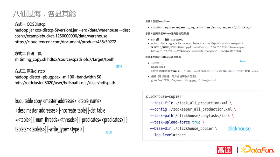 高途最终选择了腾讯云,此处并非对其它厂商存在否定之意,只是综合考量,在当时场景下,这是最贴合我们需求的一个选项。具体到模块,能替换原有服务的都尽量做到物为我用。● 实时框架:腾讯云产品 Oceanus 是一个实时平台,与我们原来自研的实时系统是很接近的,直接替换自研的调度平台;● 离线系统:腾讯的离线系统,和我们自己的有很大差距,所以我们就沿用原来自研的数据管理系统,而只使用他们的 EMR;● 其它引擎:例如 HBase、Kudu、ClickHouse 等,云厂商的运维能力更强,成本也更低,都做相应的切换。① C 端业务绝对不能受影响,所有迁移工作都要在夜间低谷执行;② B 端业务也尽量在低谷期操作,但可接受短期(默认1小时)的不可用,并保证最终可用;③ 无人认领的任务,可做暂停处理并等待反馈,同时要保证在一段时间(默认3个月)内可随时恢复;④ 离线链路全部双跑,非重要链路行数一致即放行,重要链路除对比行数外还要比对关键指标,极重要链路延长比对周期;⑤ 实时链路可不双跑,迁移前做好数据同步(一般为快照同步)准备,并确保新集群与消息队列和输出引擎间的网络可通;⑥ 老集群任务和表下线采用自顶向下模式,随时做好任务回滚准备(离线任务做重跑,实时任务重置偏移量消费),表可禁用的引擎(如 HBase)做禁用,其它的做停写处理,观察用户反馈;迁移工作中,我们总结了 7 点原则。提出这些原则是由于,我们人数不足而且精力有限,不可能一次性完全做到位,所以我们只能把事情拆分出来,哪些重要的提高优先级,花费精力做好迁移,哪些不重要的可以做一些让步。原则的 4~6 项主要是对于安全性方面的支持不详细展开了,简单解释一下前三点:● C 端业务:比如说用户有学生在高途平台上面买课,结果一提交订单时发现账户余额都没了,这就是大失误,是完全不能接受的;C 端的业务是绝对不能受影响的,所有迁移都在夜间低谷进行;● B 端业务:反过来说对于 B 端业务,因为用户都是自己人,可能相对更宽容一些,所以能接受短期的不可用,我们当时默认设置是一小时,但以实际情况来说有时还可以适当的放宽;● 无人认领的任务:不论任务还是表,找不到负责人了怎么办?我的想法是暂停维护,但同时要满足一点,如果有人找上来的话,让它随时处于一个可以恢复的状态;保留时间设为了三个月,三个月以后如果还没人找,任务和表会彻底删除;最后提醒一点:事事留后招,不做一锤子买卖。做迁移这种大事,一定要杜绝“不成功便成仁”的想法。