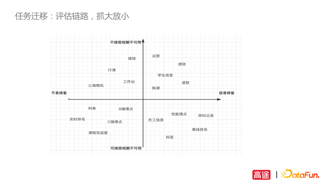 数据迁移说完谈谈任务迁移。任务迁移也是讲主次分明,要把有限精力都放在刀刃上,重点还是说不会影响 C 端用户,不会影响“不接受任何停顿和不可用状态”的这种服务;然后根据修复难易度做四象限的拆分,确认哪些应该投入更多精力,哪些简单处理就可以了,原则还是抓大放小。