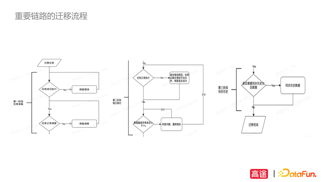 实际迁移的重点,首先是单次任务的迁移和比对,每到发现问题的时候,立刻要检查,可以根据整个链路从底向上检查,如果底层最后一个环节多次比对数据都一致的话,则认为这个链路是可靠的,可以通过了,如果最后一个环节不行就逐层往上走,看是哪一层出了问题。对于不重要的链路,对数相对简单,比如如果连续几天新旧环境行数是一致的,那么就可以认为通过了;重要链路可能就要麻烦一些,需要核对指标,比如某个列的 sum 值,average 值,然后再去更长周期比对,确保一致才可以放心。