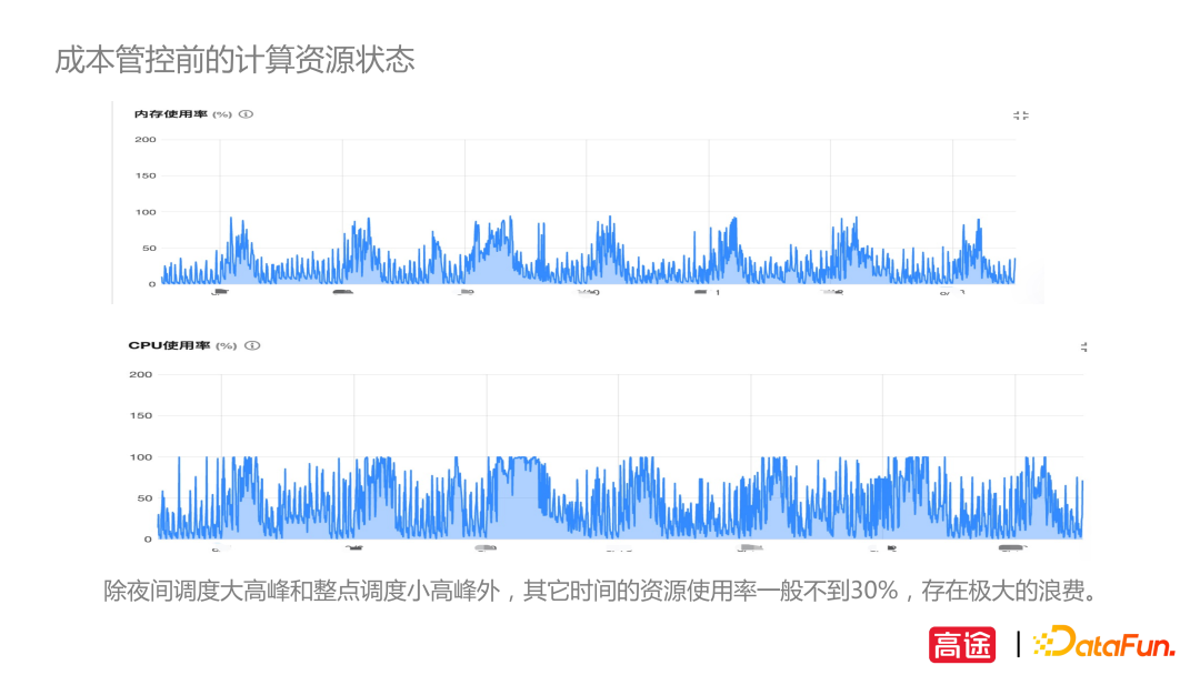 上图是计算资源的状态。每天夜间会有大批量调度去执行,资源使用率飙到很高,接近100%;但是在白天的时候却显得风平浪静,仅在小时级任务执行时有轻微的波动,说明在白天存在极其严重的浪费,这些钱是白花的。