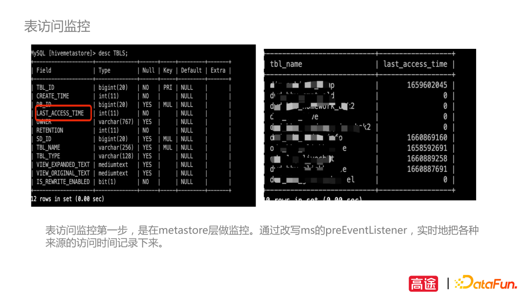 ● 传统监测方式:熟悉 metastore 人都了解可能见过,在关于表的元表 tbls 里边有一个列 LAST_ACCESS_TIME,这个列默认是不更新的,一直是 0;通过在 hive 配置中添加 PREHOOK,就能接收到 MapReduce 这种引擎的表访问记录,可以把时间戳更新;其缺点是只能记录 mapreduce 的访问,但我们还有其他数据引擎,比如 spark、impala、presto 的查询是记录不到的,所以它对我们监控表的访问有借鉴意义但覆盖得不够全面;● 高途的改进:不论什么引擎来查表都要经过 metastore,所以我们在 metastore 里改写了 preEventListener,metastore 监听到表被查询时,就去修改 tbls 表的 LAST_ACCESS_TIME 字段把时间记录下来;经过这个改进以后,所有来源的查询行为都真真切切的被记录到元数据里边了。● 静默率:这时候我们引出了静默的概念,定义是一个表如果连续 30 天没有任何访问,它就是“静默”的;当时迁移上线以后发现我们的数仓里高达 80% 以上的表都处于静默状态,这也是一个很严重的浪费,需要进行管控。监控了所有表的访问并统计了静默率后,前文提到的表的浪费和分区的浪费问题就可以解决了。