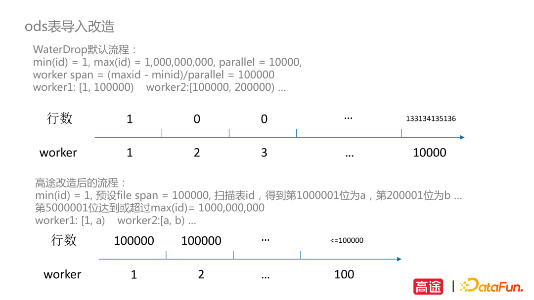 下一个要解决的是碎文件问题。碎文件基本都来源于 ods 导入,不管是用传统的 Apache Sqoop、阿里 dataX,或者我们现在用的 waterdrop,天然都存在碎文件问题,原因如下:● 碎文件产生原理:当拉数的时候,waterdrop 总是去算你取得切分键的最小值和最大值,然后根据两个极值及提交的并发度去算 span,即每一个 worker 的上下限额。比如要查的部分数据,最小的 ID=1 最大 ID=1,000,000,000(10亿),并发度设置是 10,000;所以要求就是每个 worker 查最多 10 万条记录,此时 worker1 条件就是 where ID>=1 and ID<100,001,worker2 条件是 where ID>=100,001 and ID<200,001,以此类推;但是数据的实际情况有可能是第一条记录 ID=1,第二条记录 ID 就已经是5亿多了,因为第一条数据奇异歧义的分布导致了整个任务分布向左拉伸,结果是很多任务的空跑,第一个 worker 可能产生 1 条数据的文件,中间这些都会产生行数为 0 的空文件,最后一个 worker 任务干了绝大部分的活但执行还慢,然后会产生很大的文件,甚至出现很多小文件或者碎文件,这是拉数时存在的问题;高途的改进是,拉取数据的时候去扫描库里的切分键链,当然一般选主键,所以它的速度顺序还可以,然后根据我自己提供的 span 去拉数。