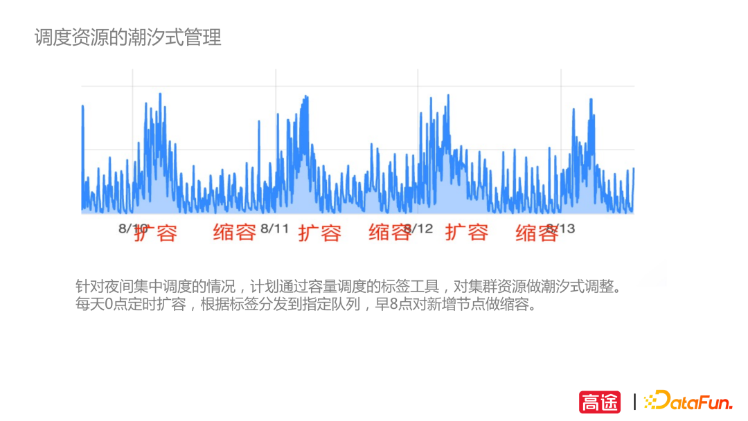 潮汐资源管理是属于使用云原生的技术能力,依赖集群的容量调度的标签工具,在每天夜晚把资源扩容,保证能扛住夜间的调度高峰;然后到白天比如早上 8 点的时候,我们知道白天时间段可能不再用这么多资源,就把夜晚的扩容部分缩掉;假如按刚才说到的白天常规 30% 的资源使用率,就将这些作为常规储备,另外 70% 作为夜间的潮汐性扩容进来的资源(假定扩容资源每天只用 8 小时),这样计算成本也就是 30%,再加上 70% 乘以 1/3,也就只剩 51% 的综合成本了。