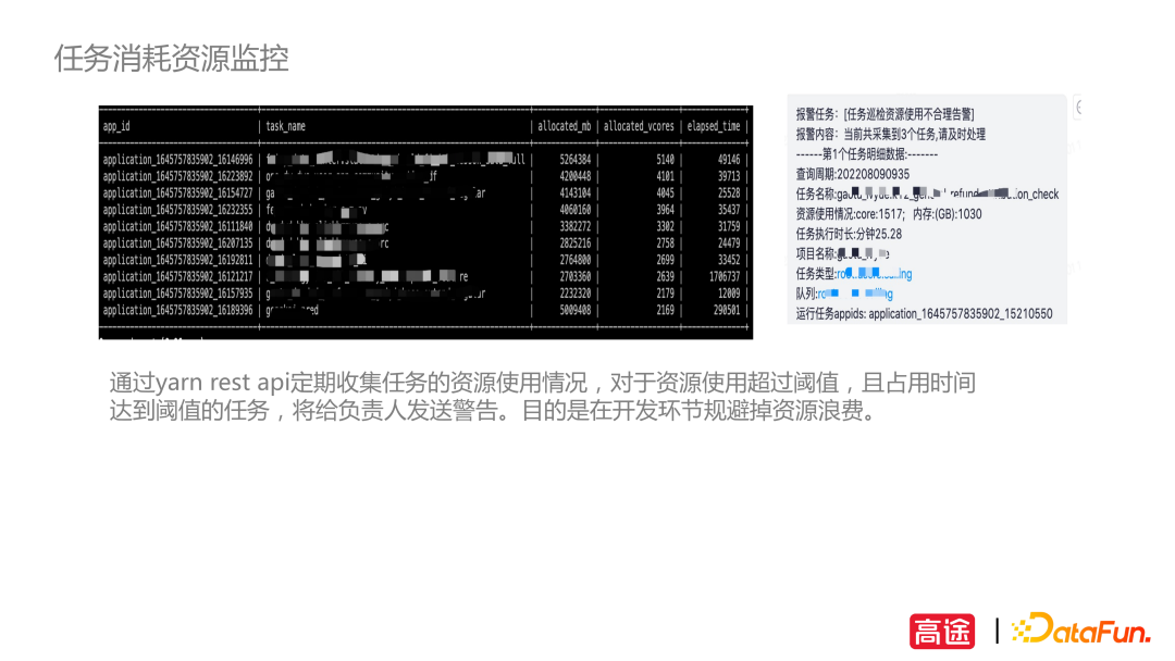 任务的监控,依赖于 yarn rest API 周期性的收集平台跑的任务,要针对设定的阈值,比如这个任务占用 core 的核数超过了一定数量或超过了一个比例,或者资源超过了一定数量比例,而且持续时间达到了确定分钟数的话,就在企业内部 im 上给负责人发出报警,强制其整改,这样也能间接的把资源浪费问题解决掉。