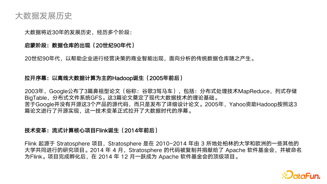 第一个阶段在 90 年代,随着商业智能 BI 的出现,企业通过处理数据去进行决策分析,因而产生了面向分析的传统数仓。第二个阶段在 2005 年前后拉开序幕,以离线大数据计算为主的Hadoop体系诞生,它来源于谷歌的三篇鼻祖型论文(俗称:谷歌三驾马车),分别是分布式处理技术(MapReduce)、列式存储(BigTable)、分布式文件系统(GFS),这三篇论文奠定了现代大数据技术的理论基础。第三个阶段是 2014 年前后,流式计算核心开源产品Flink的出现。Hadoop 体系主要以离线大数据计算为主,在近实时计算方面,虽然能够有一些体现(比如 Spark Streaming),但存在比较多的问题,比如用 Spark Streaming 去做微批处理,虽然吞吐高,但性能不好。2014 年前后,流式计算核心项目 Flink 的诞生,开始真正地做到流式计算。