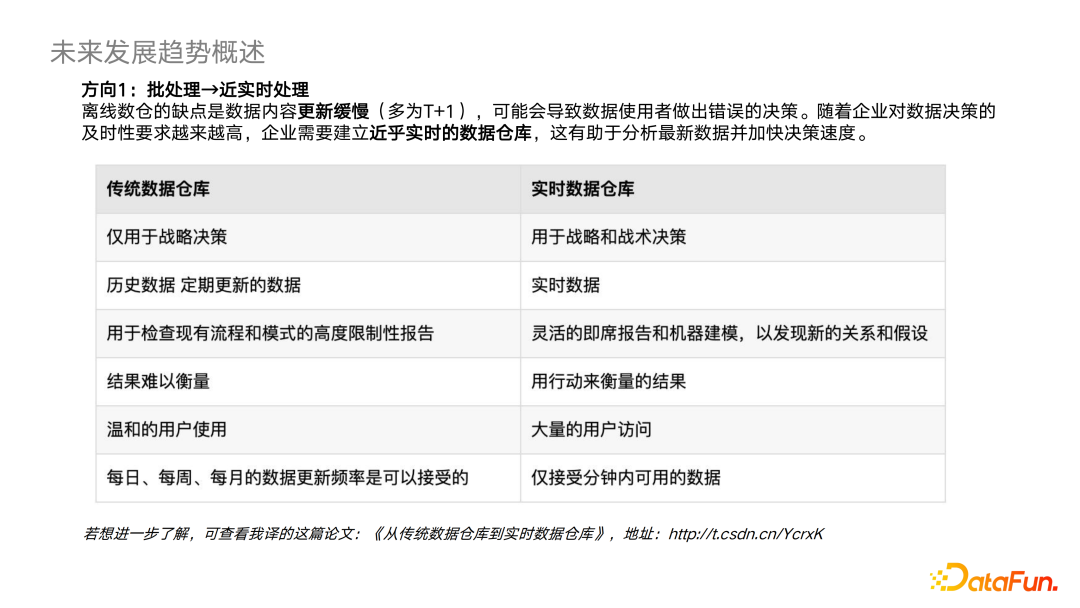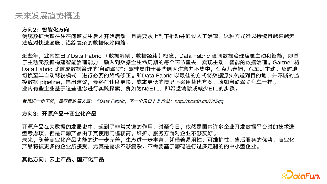 第一个趋势是批处理到近实时处理。随着时代的发展,企业对实时性要求越来越高,比如电商类销售和监控的场景,需要建立近乎实时的数据仓库,有利于分析最新数据并加快决策速度。第二个是智能化的方向。即引入人工智能的方式去进行数据治理,通过这种方式去解决传统数据治理等过程中响应速度慢,开发成本高等问题。第三个是开源产品到商业化产品。时至今日,大数据开源产品依然是国内许多企业开发数据平台的技术选型。但开源产品使用门槛比较高,维护服务对企业不够友好。未来商业化产品会逐步在许多场景下替代开源产品,尤其是对于需求不太复杂的中小型企业。
