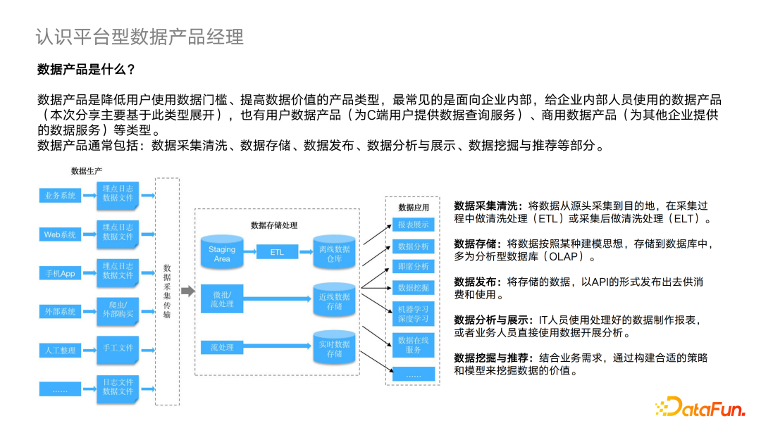 数据产品用来降低用户使用数据门槛,提高数据的价值,从生产采集、存储处理、分析展示到挖掘应用的全链路,都可以称之为数据产品。进一步细分,还可以分为面向企业内部,面向用户,以及面向外部企业等类型。