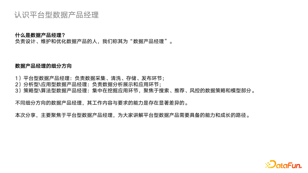 数据产品经理就是负责设计、维护和优化数据产品的人。通常情况,数据产品经理分了三个方向:第一类方向是平台型数据产品经理,主要负责数据采集、清洗、存储、发布;第二类是分析应用型的产品经理,主要负责数据分析、展示及应用;第三类是策略算法型,主要集中在数据挖掘应用环节,聚焦于探索、推荐、风控的数据策略和模型部分。