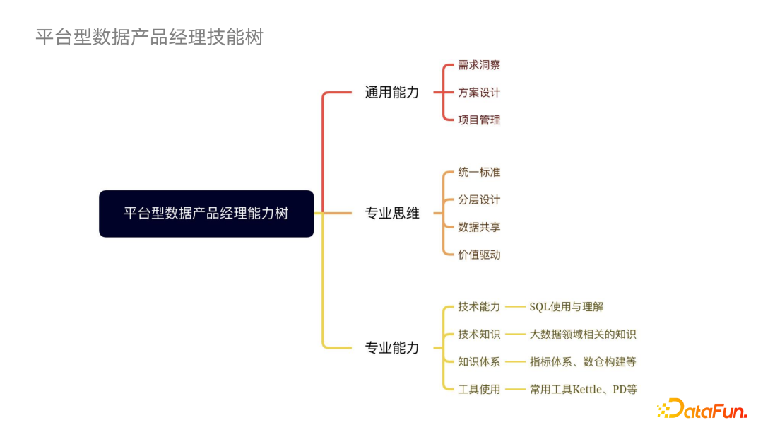 平台型数据产品经理能力树如下,可以总结梳理为 3 大类 11 个技能点。