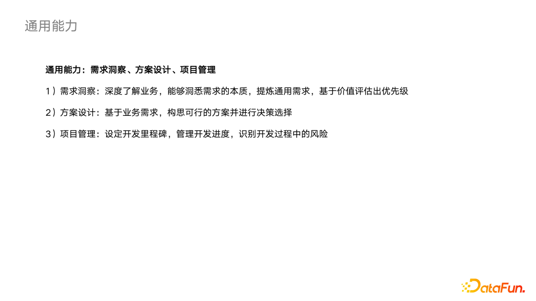 - 三是项目管理能力,产品开发的每个迭代周期需要把开发计划进行拆解出不同的里程碑。通过里程碑的设计,提前进行任务排期、风险管控,从而有利于在开发过程中进行进度跟进、风险识别及处理等。以上都是产品经理需要具备的通用能力。