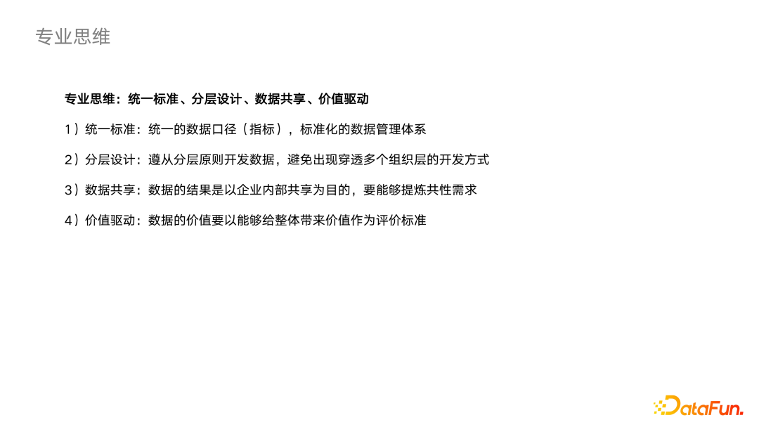 第一点是统一标准,产品经理经常会与指标打交道,在面对多类型指标时,需要达成统一标准。以增长率为例,A 部门的增长率和 B 部门的增长率,背后的计算逻辑可能不一样,或者两个部门有两个指标,看起来计算逻辑是一样,但是名称不一样,这些都需要去考虑并完成标准统一,从而降低后续维护成本和用户使用成本。第二点是分层设计,在进行指标拆解的时候,要遵循分层的原则,拆解出通用的指标,避免从最底层穿透到最上层直接进行数据开发。第三点是数据共享,要能够整合、提炼出共性需求,再进行开发,在缩减开发成本的同时提高产品未来的可维护性。第四点是价值驱动,数据的价值要以能够带来整体价值作为评估标准,面向价值的理念要贯穿需求评估、产品设计及开发应用全流程。