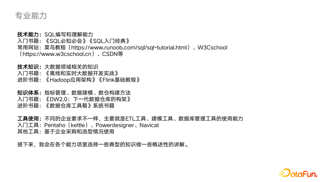 - 第四个方面是工具的使用,工具主要分为 ETL 工具、建模工具、数据库管理工具等(建议基于企业自身情况去进行学习使用)。