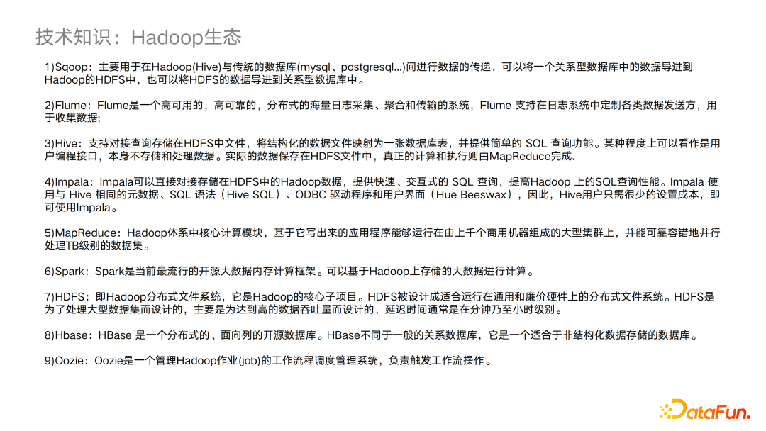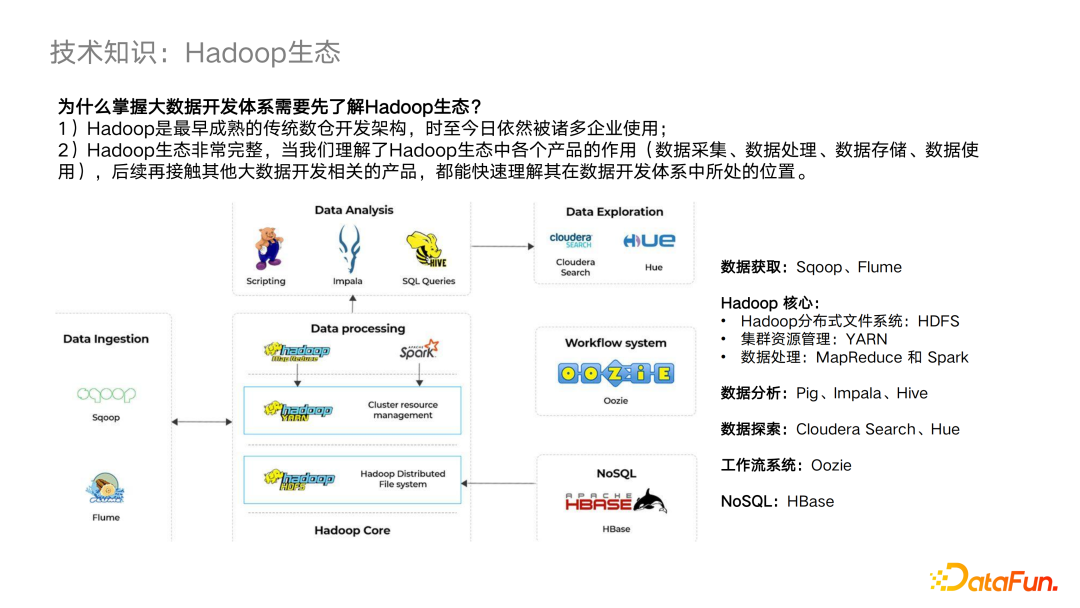 接下来在各个能力项里面选一些典型的知识,做一些概述性的讲解。掌握大数据开发需要先了解 Hadoop 生态,因为它是最早成熟的传统数仓开发架构,至今依然被诸多企业使用,另外 Hadoop 生态非常完整,当熟悉了各个产品的作用,后续再去接触其他大数据开发相关的产品,都能够快速理解其在数据开发体系中发挥的作用。