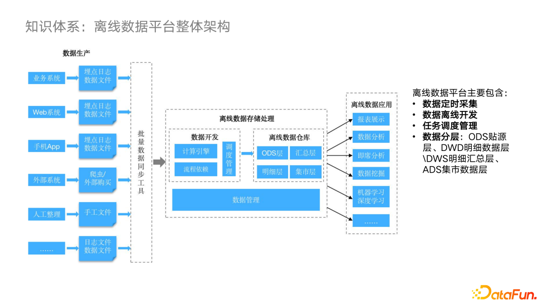 离线数据平台和实时数据平台的整体架构有两个明显差异点,首先,离线数据平台是定时的采集,离线的开发;另外,离线数据仓库是分层的理念,包括 ODS 层,汇总层、明细层、集市层等,实时数据平台没有这种分层理念。