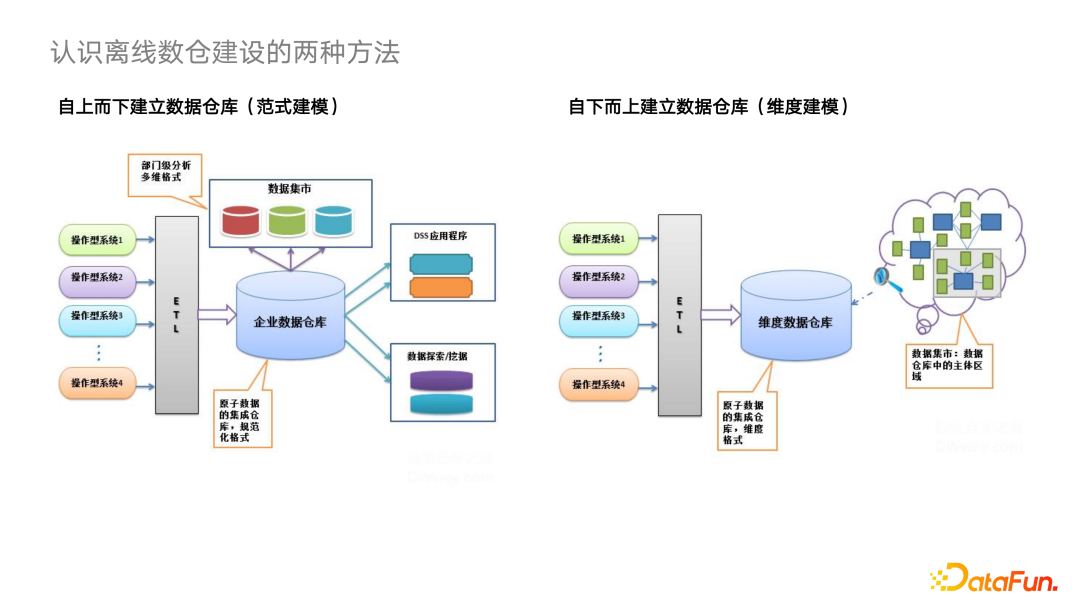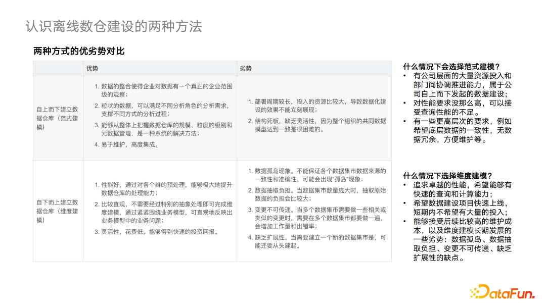 自上而下构建要求层次特别清晰,且遵循第三范式,避免数据冗余,优势是结构比较清晰,缺点是梳理设计开发的流程会很缓慢。自下而上特点是面向分析,面向主题,例如 A 部门有分析需求,就针对 A 部门的分析需求去建主题,去进行设计开发,B 部门有分析需求,再针对 B 部门去做分析主题,最终不同的分析主题形成一个大的数据仓库,问题在于会有数据冗余,会出现数据孤岛等现象。如果公司层面有大量资源投入,部门之间协调推进能力比较强,可以用第一种,但如果企业需要快速的看到成效,得到结果,追求性能,可以选择第二种,通常情况下两种结合起来去用。