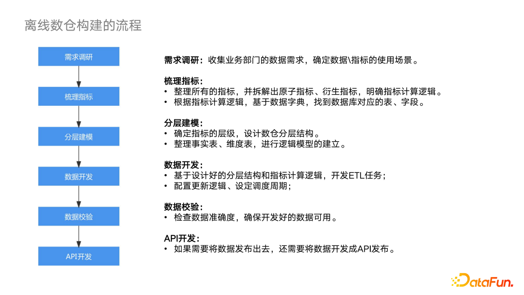 第一步是需求调研,需要收集业务部门的数据需求,确定数据指标、使用场景,要求平台数据产品经理,要有很好的需求理解能力;然后基于数据需求,进行指标拆解、建立联系,明确指标计算逻辑,确保指标口径统一,并且基于指标计算逻辑,按照数据字典,找到数据库对应的表格字段。当指标梳理好以后,就可以进行分层建模。按照提前设计好的层级去设计分层结构,整理出事实表、维度表进行逻辑模型的建立。接下来就进入比较重要的数据开发环节,基于设计好的分层指标和计算逻辑去开发,再配置更新的逻辑,设计过程中要考虑数据的更新方式,如全量或增量更新、使用周期等。数据开发完成后,需要进行数据校验,确保数据是准确、可用的,这样才能够支撑后面的数据分析、展示和应用。最后 API 开发是针对开发的数据结果,用 API 的形式给发布出去。整个环节里面,需求调研、梳理指标,分层建模是最关键的,因为这三步决定了整个数据开发的成败。