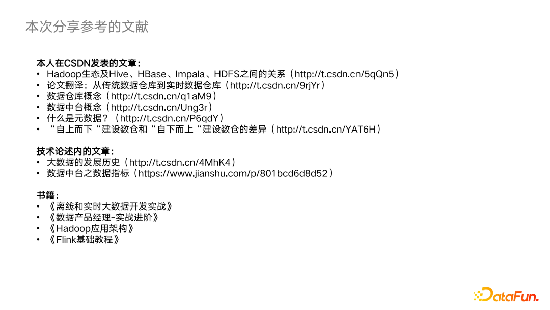 - 第三方面是知识体系,在设计数仓的分层设计以及分解指标的时候,需要一套方法论(PPT 中列举出来一些书籍供参考)。