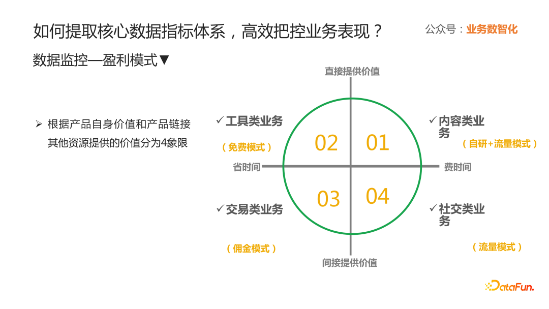 首先介绍三步走中的“监控”。以数据监控产品为例,如何去提取一些比较核心的数据指标,构建指标体系,再进行高效的业务分析。针对不同的业务,在做监控产品时,大家可以通过以下方式进行: