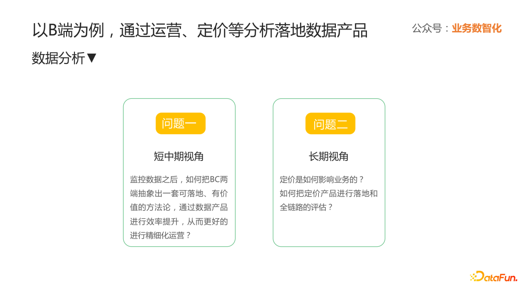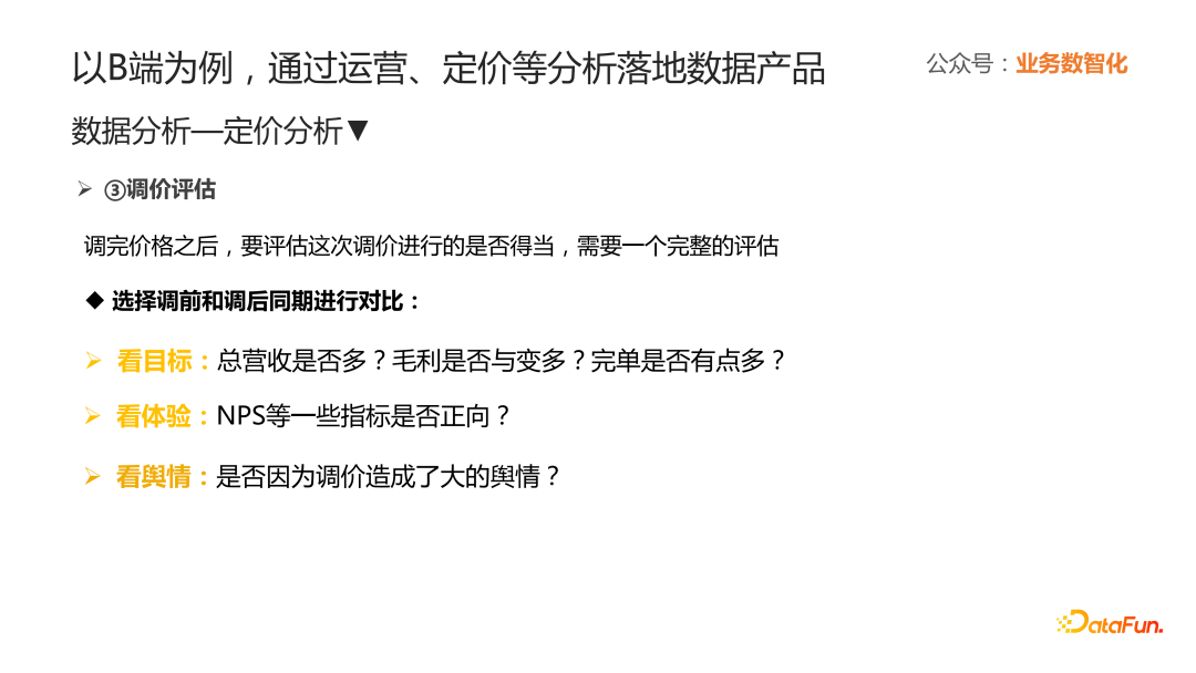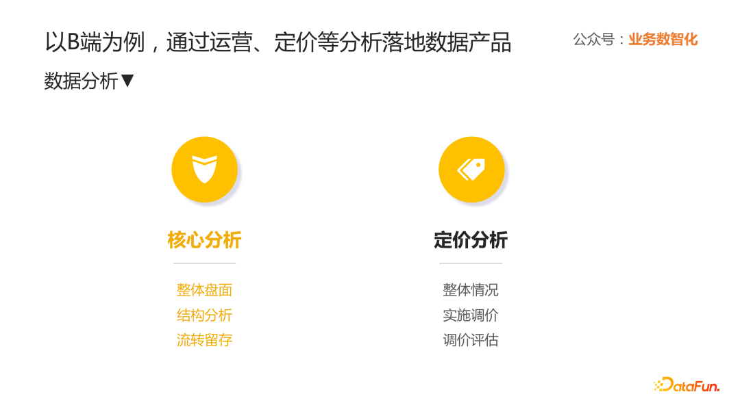 业务侧:业务侧更精细化的一些运营需求,可以通过第二步数据分析里的核心分析,落地数据产品的方式,给到他们相关的一些经验的传承和落地。并且定价分析可以解决如何评估定价效果的问题。关于数据诊断,因为管理者会关注核心指标,所以有一些业务同学也是需要去看的。
