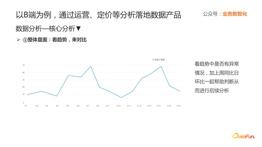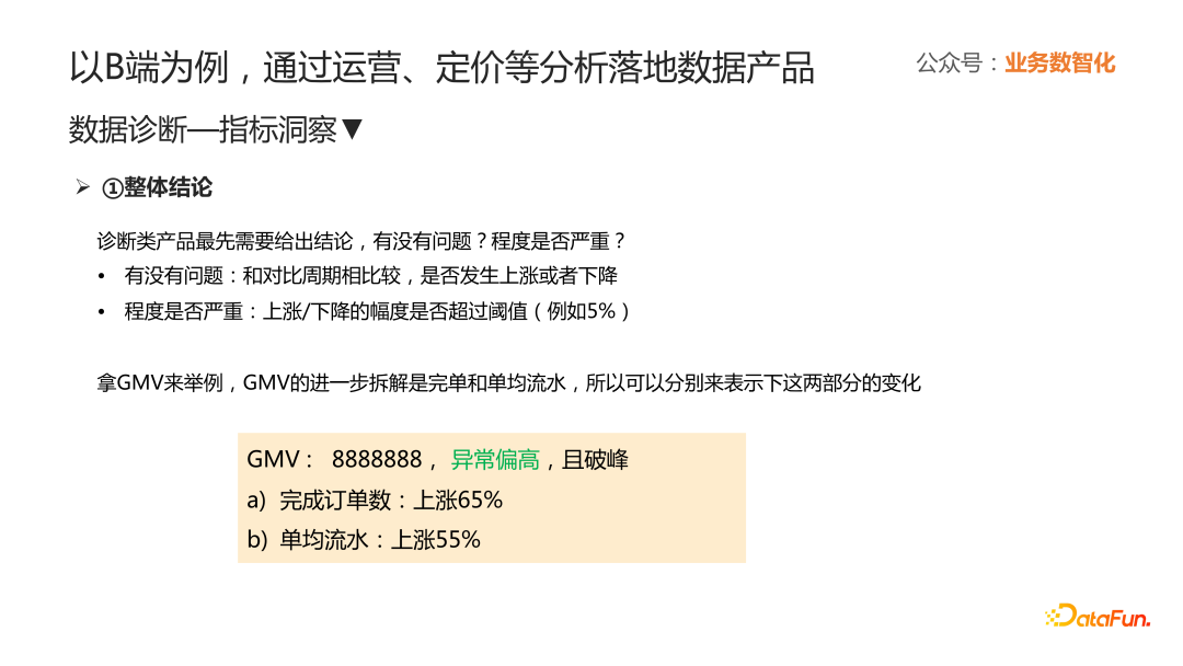 首先,需要给出结论是异常偏高的,还是正常的或偏低的。可能这个地方或区域破峰值了,这种情况对 GMV 要做相关的一些拆解,比如完成订单数涨了,还是客单价单均涨了。