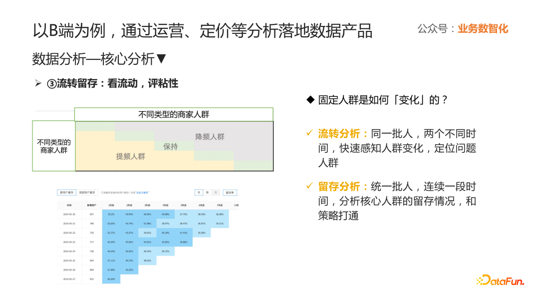 留存分析:我们再做一些关于流转留存方面的分析。以 B 端商家人群为例(8 月),把商家人群分为不同的人群类型:高潜的商家,核心的商家,新商家。把 8 月的人群标签固定,看 9 月份这些商家流转是怎么样的,很可能会出现以下三种情况的变化,一种是从新商家人群转移到成熟的商家,可能会有一个显著的提频,这是我们都愿意看到的正向的走势;还有一种是从 8 月到 9 月,整体人群的状态没有变,之前是成熟商家,现在还是成熟商家;还有一部分是降频人群,即灰色区域,我们是需要非常关注的,因为降频就意味着 GMV、订单量会有一些损失,谁降频了,为什么降频,是否需要把手头的一些资源给到这些用户,把他们引回来。